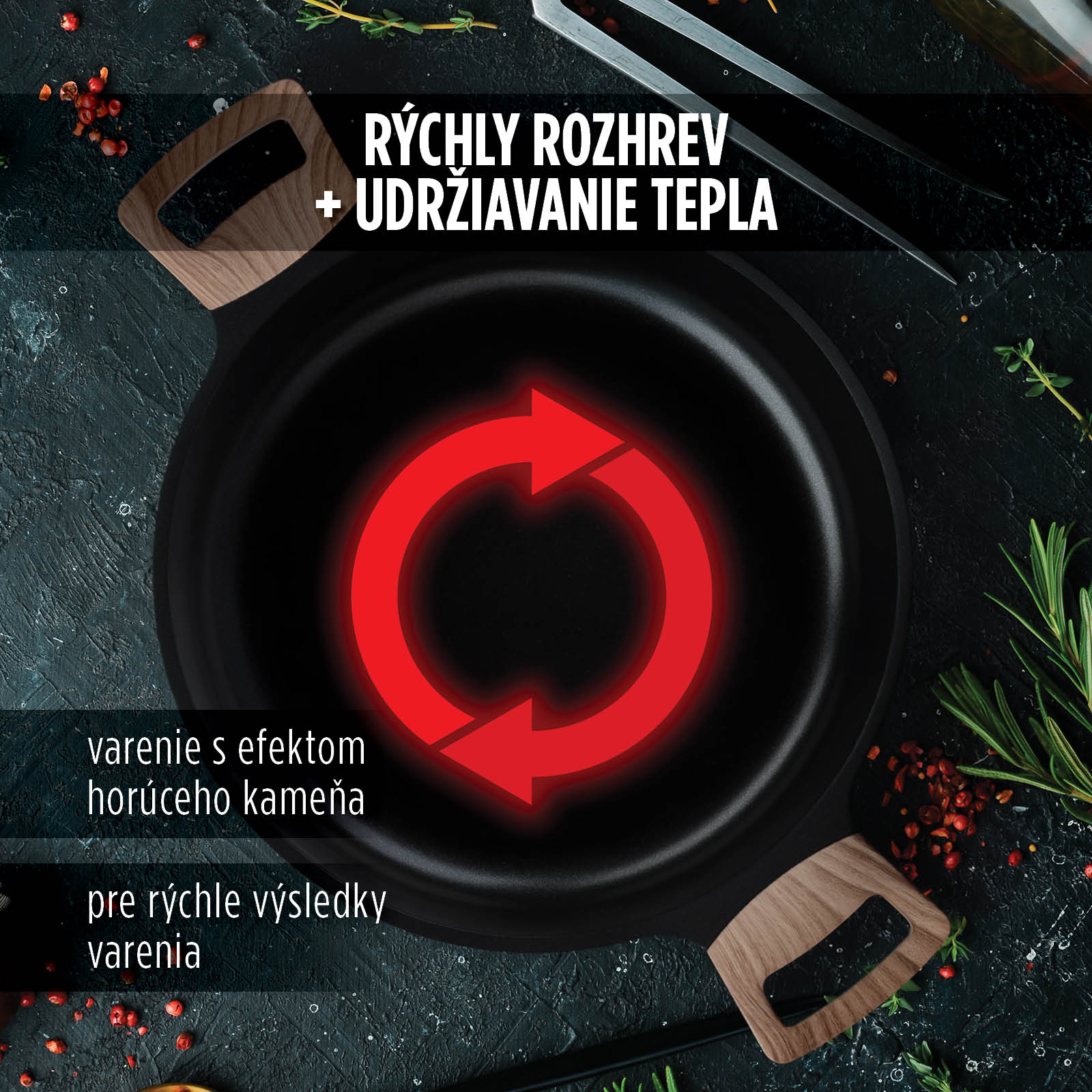 Špeciálne vyvinutá moderná technológia varenia sa spája s jedným z najstarších spôsobov prípravy jedla – na horúcom kameni. Vnútorný povrch riadu je potiahnutý hladkým minerálnym povrchom vyvinutým v Nemecku, ktorý umožňuje prirodzený spôsob varenia a pečenia. Vďaka jeho výnimočným vlastnostiam stačí pri varení len minimálne množstvo tuku a jedlo si zachováva všetky živiny, vitamíny a minerály. Na zachovanie kvality povrchu odporúčame používať drevené alebo silikónové kuchynské náčinie.