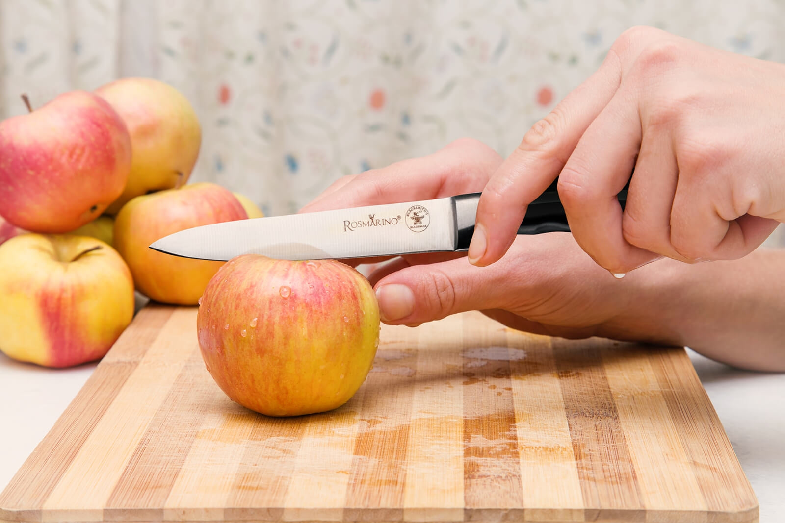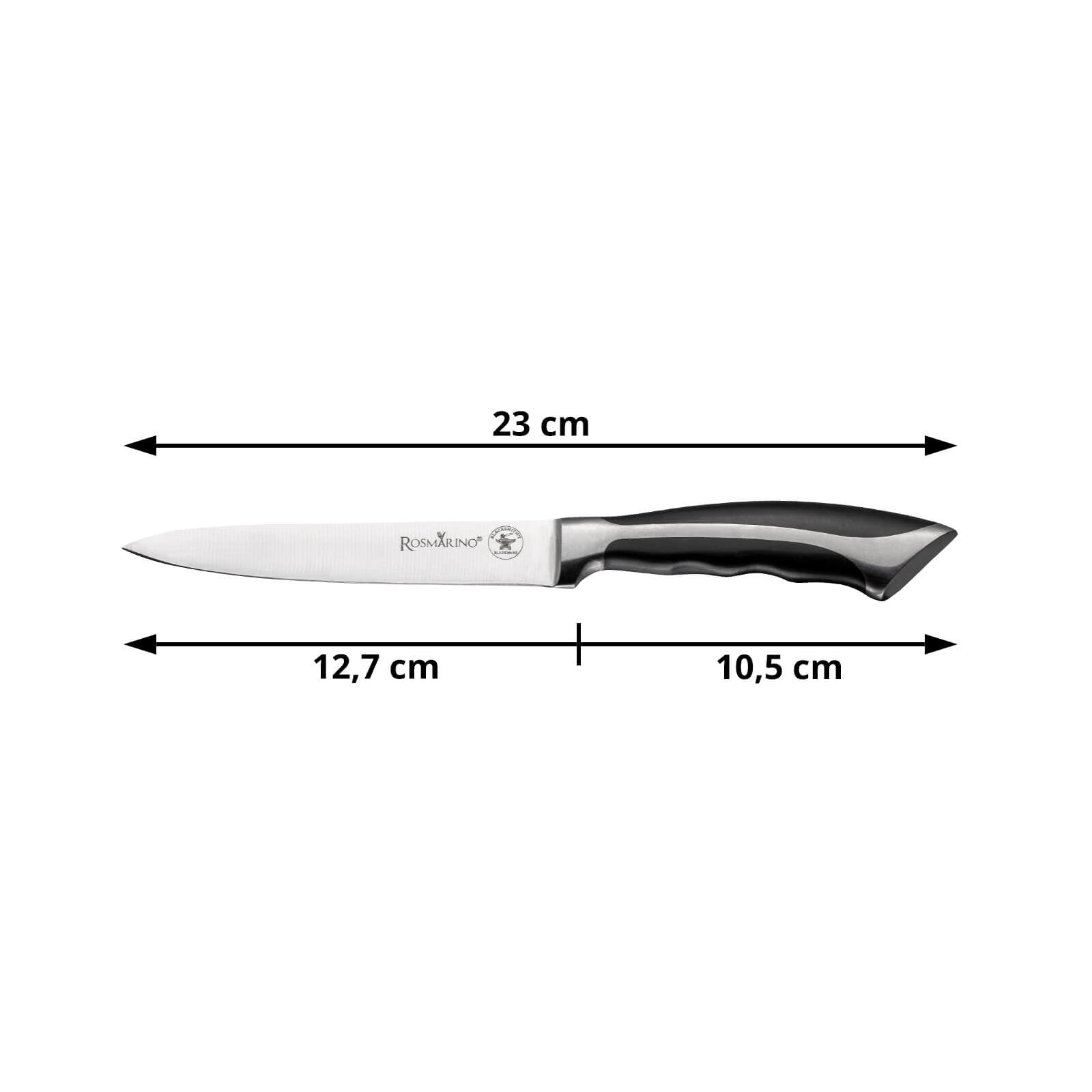 Perfektný kuchynský nôž Rosmarino Blacksmith's Utility pre všetkých kuchárskych majstrov aj začiatočníkov! Tento menší nôž je so svojím tvarom ideálny na lúpanie, krájanie a sekanie potravín. Čepeľ je vyrobená z nehrdzavejúcej ocele nemeckej kvality, odolná rukoväť je z vysoko kvalitného vstrekovaného plastu ABS, čo umožňuje maximálnu záťaž. Profesionálna ostrosť vám pomôže rýchlo a presne nakrájať potraviny na tenšie plátky a menšie kúsky. Výhodou noža je obojstranne ručne brúsená čepeľ pod uhlom 15° pre dlhotrvajúcu ostrosť a odolnosť. Vďaka špeciálnemu brúseniu je nôž dodatočne odolný proti korózii, hrdzi a škvrnám. Nôž sa jednoducho čistí pod tečúcou vodou s trochou saponátu.