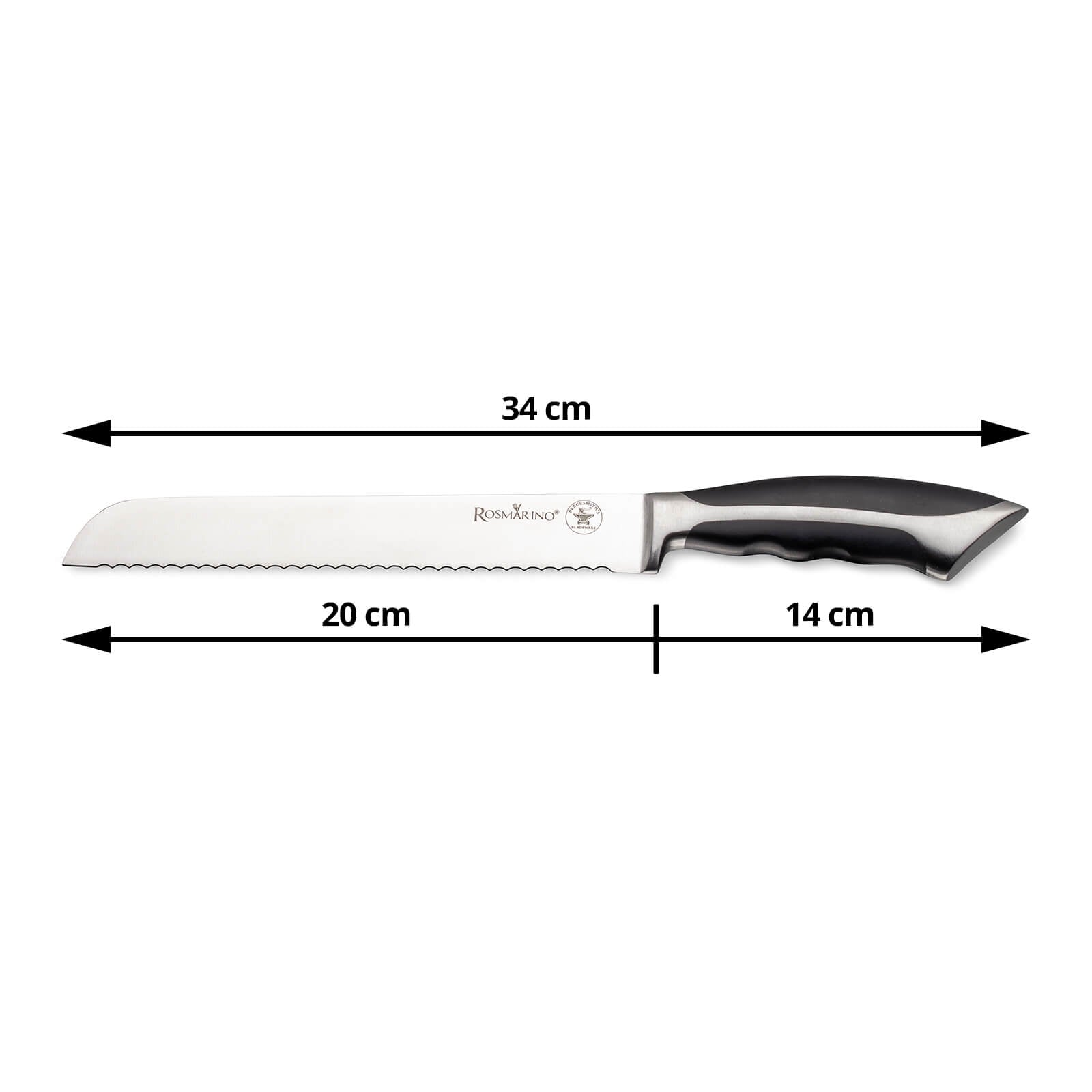 Perfektný kuchynský nôž Rosmarino Blacksmith's pre všetkých kuchárskych majstrov aj začiatočníkov! Nôž je so svojím tvarom a ostrou zúbkovanou čepeľou ideálny na krájanie chleba. Čepeľ je vyrobená z nehrdzavejúcej ocele nemeckej kvality, odolná rukoväť je z vysoko kvalitného vstrekovaného plastu ABS, čo umožňuje maximálnu záťaž. Profesionálna ostrosť vám pomôže, aby boli krajce chleba presne a rovnomerne nakrájané. Výhodou noža je obojstranne ručne brúsená čepeľ pod uhlom 15° pre dlhotrvajúcu ostrosť a odolnosť. Nôž sa jednoducho čistí pod tečúcou vodou s trochou saponátu.