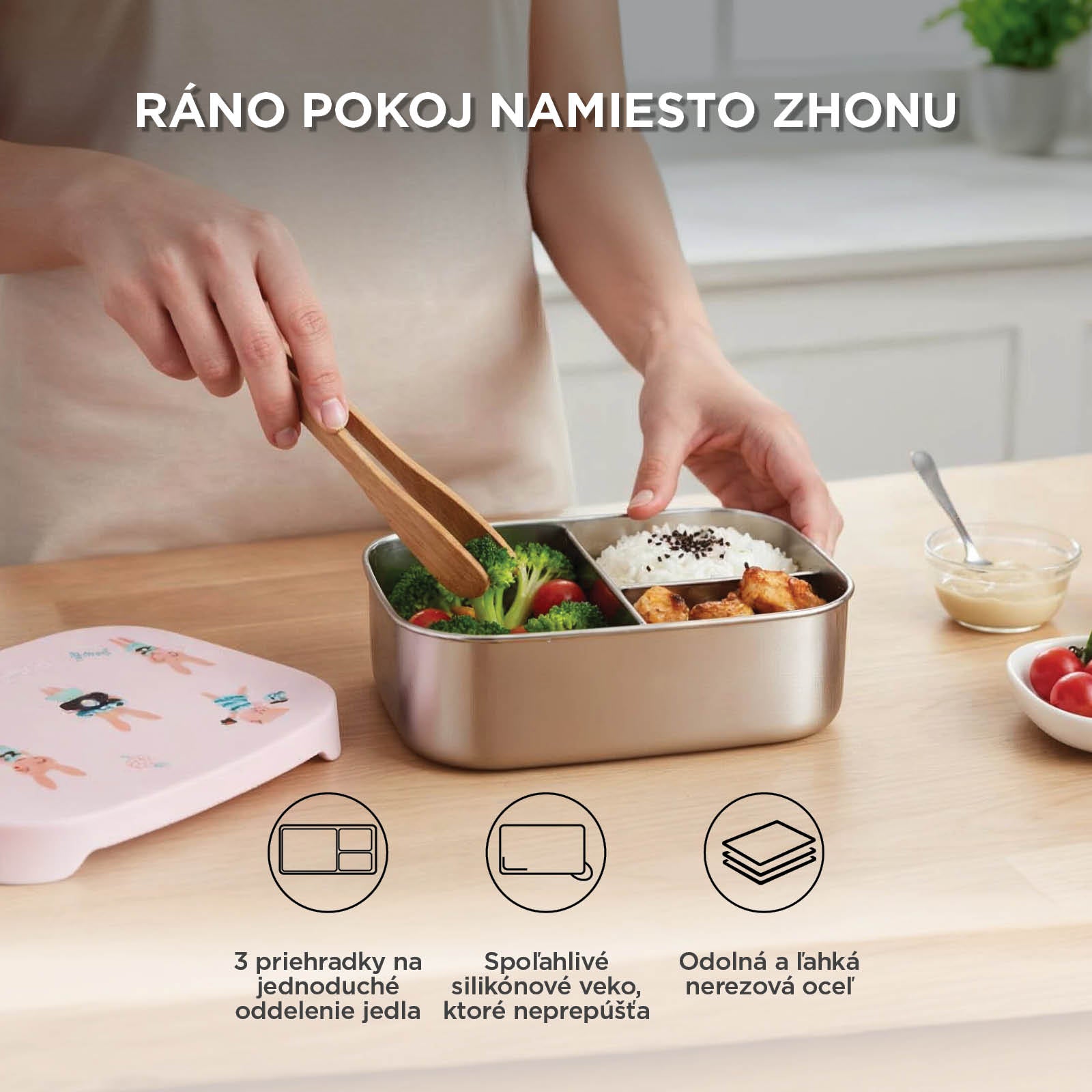 • Ranný pokoj namiesto zhonu – 3 priehradky už vopred oddeľujú ovocie, snacky a hlavnú časť jedla.