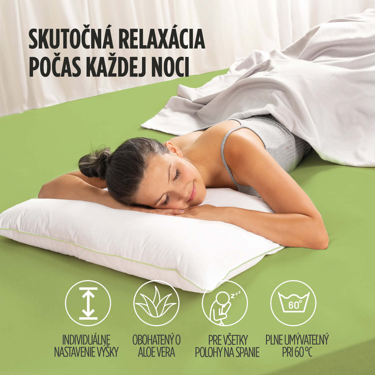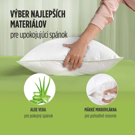 - Aloe vera v poťahu vankúša poskytuje antistresové a antibakteriálne pôsobenie počas spánku, vďaka čomu je vankúš vhodný pre všetkých, ktorí majú citlivú, začervenanú, poškodenú alebo alergickú pokožku.