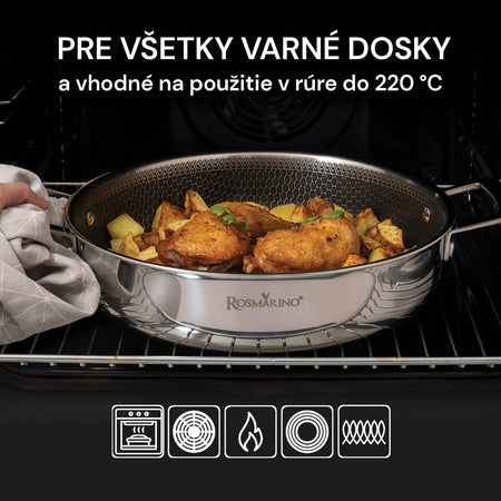 Rosmarino HexaPRO ohromuje svojou prémiovou nepriľnavou vrstvou, ktorá umožňuje bezproblémové varenie bez zbytočného lepenia potravín. To znamená, že jedlá sa nebudú lepiť ku dnu, čo uľahčuje prípravu vašich obľúbených jedál. Okrem toho je čistenie jednoduchšie než kedykoľvek predtým, keďže jedlo sa neprilepí k povrchu. Ďalšou výhodou sú rukoväte, ktoré sa počas varenia nezahrievajú (*s výnimkou použitia v rúre, kde je povinné používanie ochranných rukavíc). Varenie bude ešte uvoľnenejšie a bezstarostné.