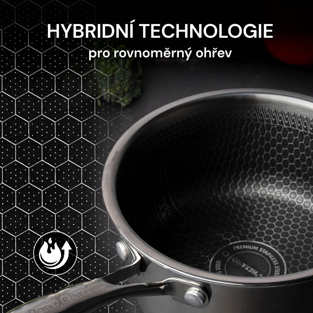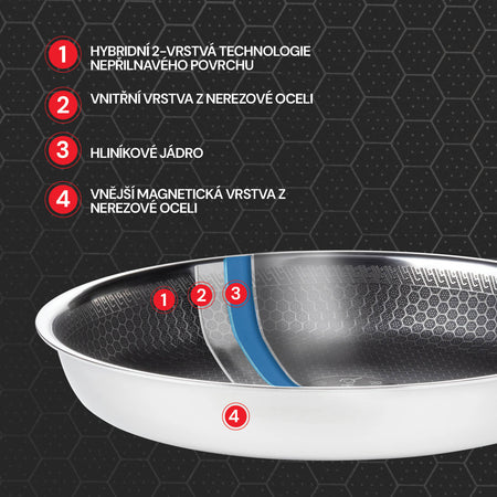 Predstavujeme synonymum dokonalosti: trvácnosť nerezovej ocele a nepriľnavé vlastnosti, ktoré robia varenie ešte jednoduchším. HexaPRO je výsledkom inovatívnej hybridnej technológie, ktorá spája viacvrstvovú konštrukciu kuchynského riadu pre profesionálne výsledky. Toto je prémiový kuchynský riad, ktorý povýši vaše kulinárske schopnosti na vyššiu úroveň.