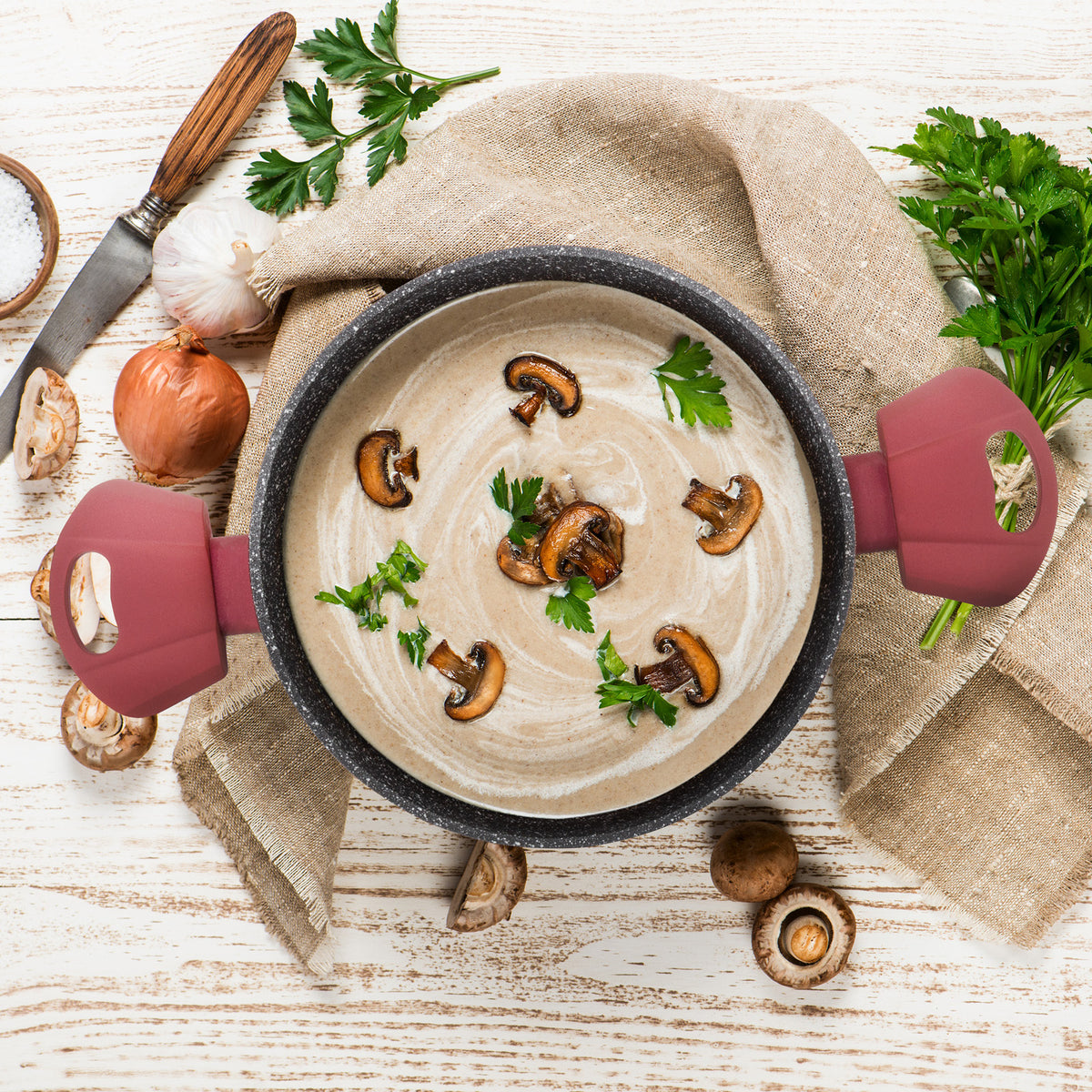 - Nepriľnavý, drsný minerálny povrch umožňuje variť s minimom tuku, takže jedlo chutí zdravo a počas varenia si zachováva všetky potrebné živiny.