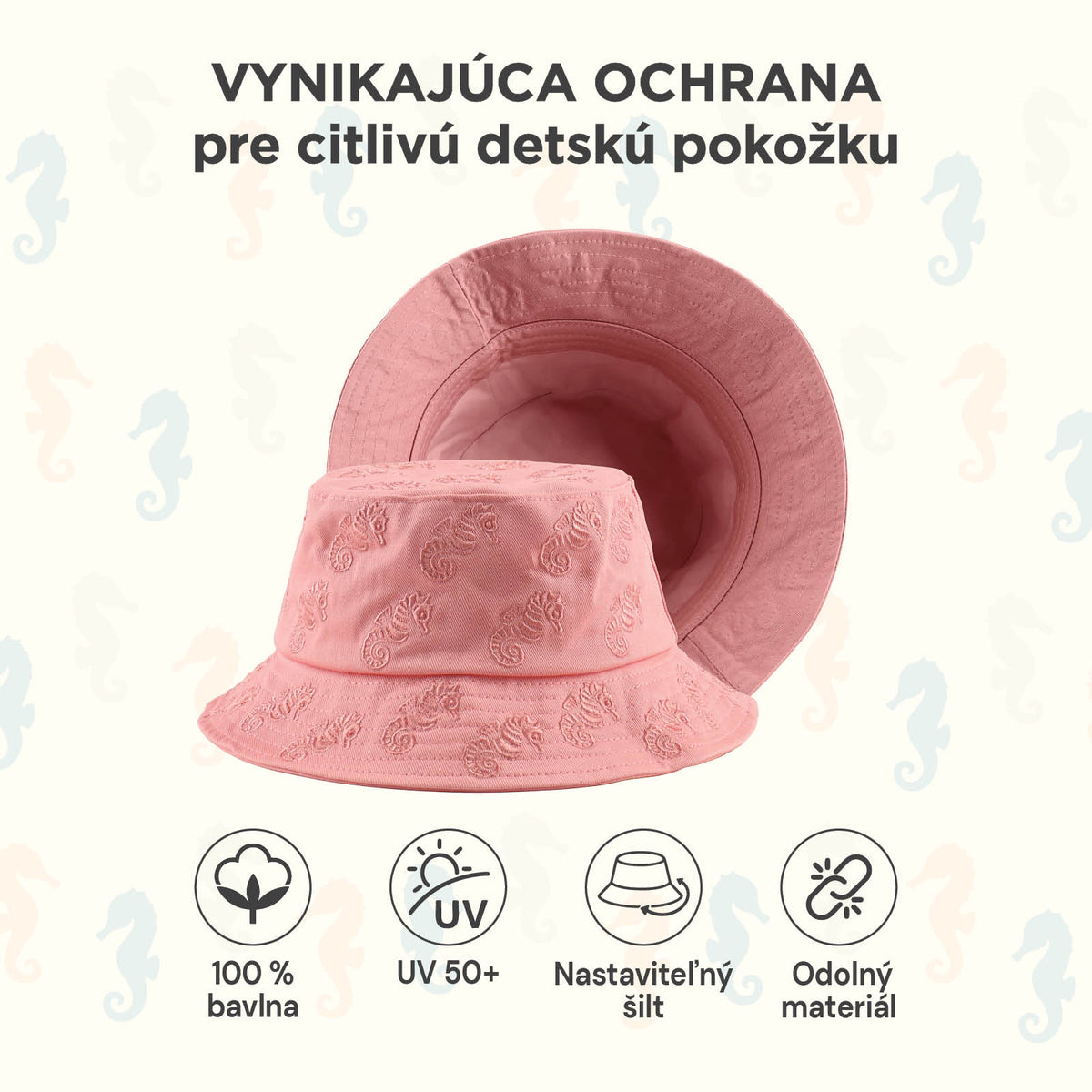 - Veselý vzor morského koníka, ktorý motivuje deti nosiť svoj klobúčik.