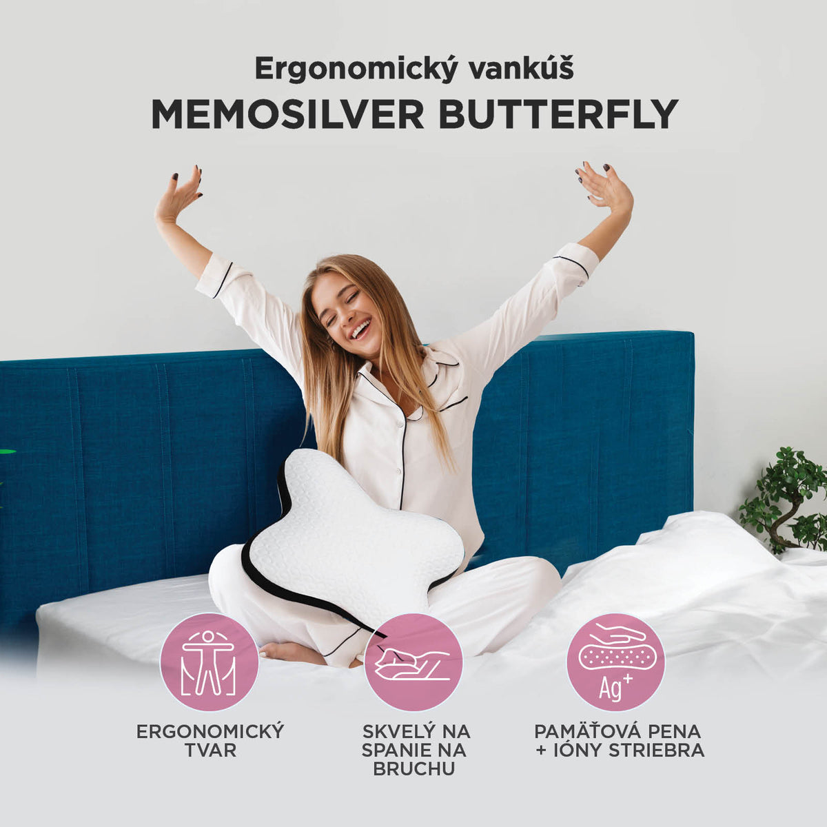 Vankúš Memosilver Butterfly, s jedinečným tvarom motýľa z peny Memotouch, pomáha pri správnom nastavení krčnej chrbtice a každú noc zmierňuje tlakové body. Poskytuje vynikajúce pohodlie a oporu pre krk, hlavu a ramená počas spánku, najmä na bruchu, pretože vďaka jeho tvaru môžete vankúš pohodlne objať rukami. Navrhnutý tak, aby vytváral antimikrobiálne a svieže prostredie na spanie bez zápachu. To sa dosahuje vďaka pridaným iónom striebra a bambusovému uhliu, priedušnému vnútornému poťahu zabezpečujúcemu maximálne prúdenie vzduchu a vonkajšiemu prateľnému poťahu.