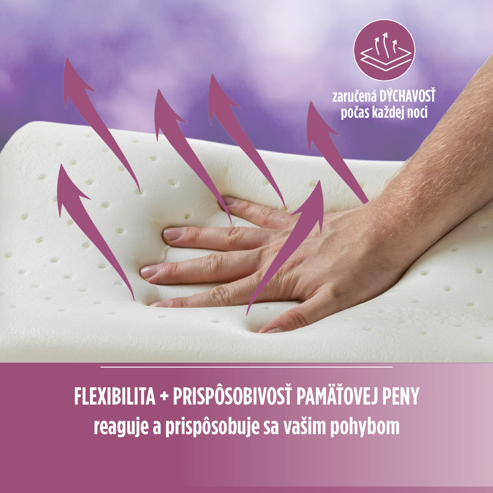 Pamäťová pena dokonale reaguje na vaše pohyby počas spánku a dokonale sa prispôsobí vašej hlave a krku. Vďaka perforovanej štruktúre zostáva priedušná bez ohľadu na teplotu miestnosti, v ktorej spíte.