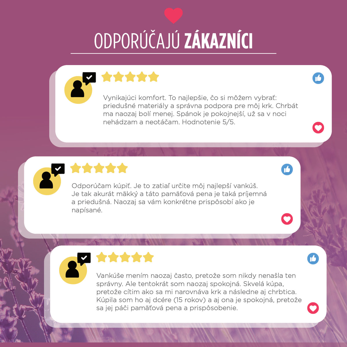 Lavender Memory ponúka najlepšiu rovnováhu pre spánok bez bolesti: univerzálny dizajn vankúša a pamäťovú penu, ktorá sa prispôsobí vášmu krku a hlave. Váš krk je v správnej polohe v každom okamihu noci a vy spíte pokojne a bez rannej bolesti.