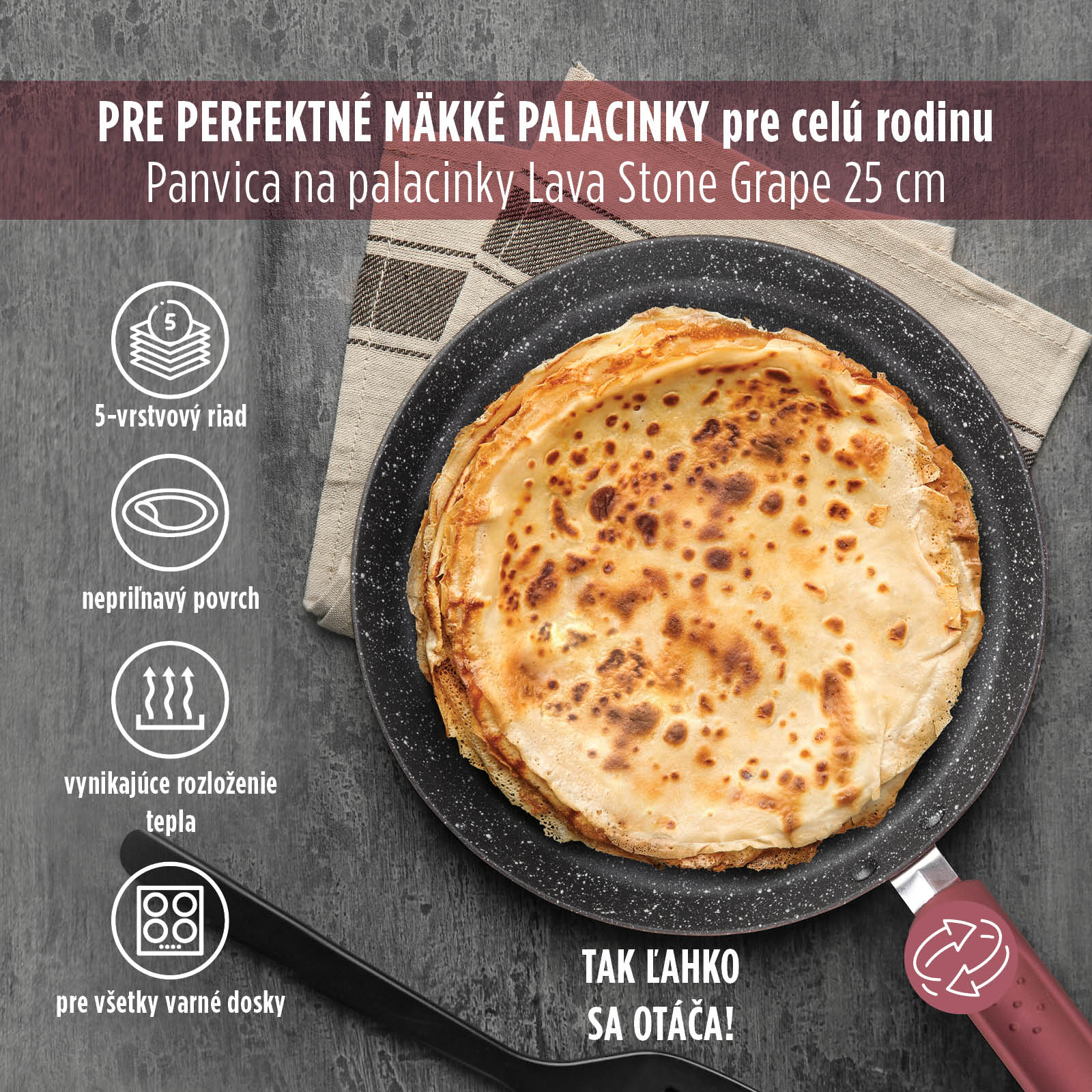 Nízka hmotnosť, ergonomická rukoväť a nepriľnavý povrch sú najlepšou vstupenkou na profesionálne obracanie palaciniek. Pripravte si dokonalé palacinky, omelety, mexické tortilly alebo vajíčka na slnku - všetko na jednej panvici! Špeciálne vyvinutá moderná technológia varenia sa zhoduje s jedným z najstarších spôsobov prípravy jedla - na kameni. Vďaka jeho výnimočným vlastnostiam môžete pri pečení a varení používať ešte menej oleja alebo masla.