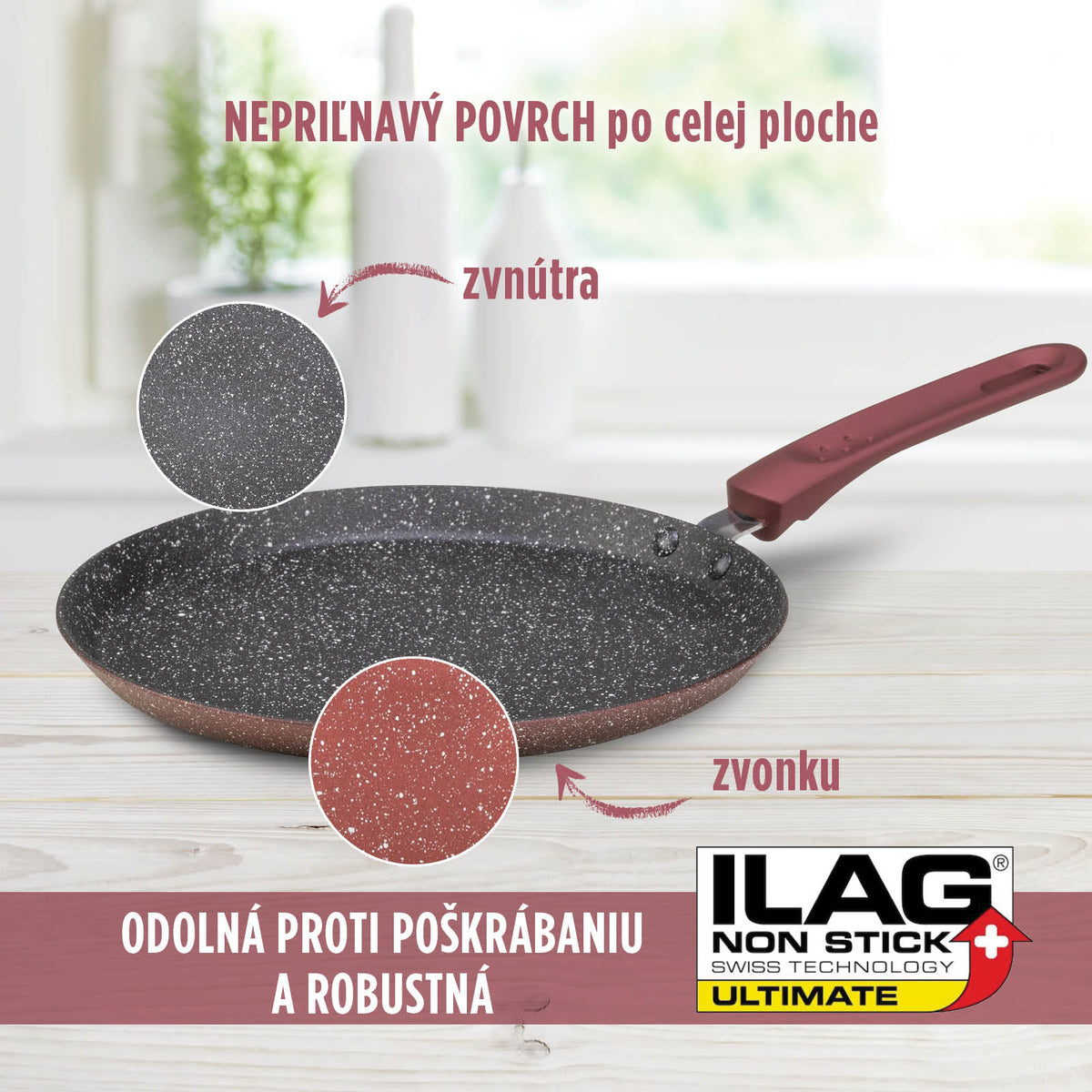 Chcete, aby sa omelety a palacinky prilepili na povrch panvice? ILAG Granistone, nepriľnavý minerálny povlak vyvinutý vo Švajčiarsku, obsahuje drsné minerálne častice podobné vulkanickým, ktoré zabraňujú prilepeniu jedla na povrch. Vďaka nepriľnavému povlaku aj na vonkajšej strane riadu je čistenie ešte jednoduchšie.