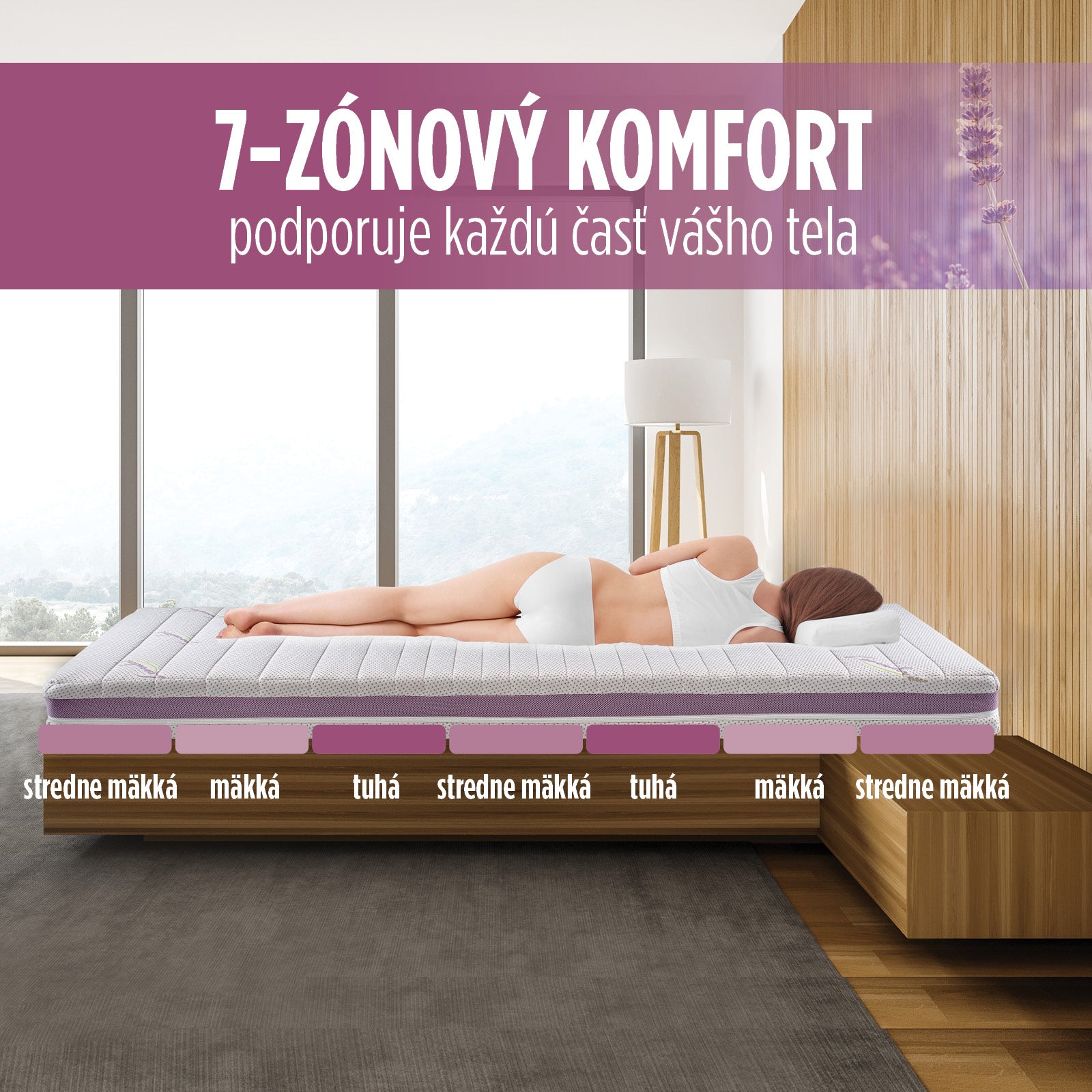 - Sedemzónový penový matrac, ktorý sa ergonomicky prispôsobí vašej chrbtici pre čo najpokojnejší spánok.