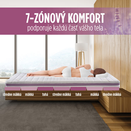 Penový matrac Lavender Comfort 16 so 7 zónami je najuniverzálnejší matrac, vhodný pre mladšie generácie a osoby s hmotnosťou do 75 kg. 7 zón s rôznou tuhosťou správne podoprie každú časť vášho tela a zabezpečí správnu polohu vašej chrbtice. Aký rozdiel môžete pocítiť? Hlbší, kvalitnejší odpočinok a dni s oveľa väčším množstvom energie. Ortopedické jadro z vysoko elastickej peny sa dokonale prispôsobí vášmu telu. Jemná vôňa levandule v poťahu poskytuje dodatočný komfort, upokojuje, uvoľňuje napätie a znižuje nespavosť. Poťah matraca je snímateľný a možno ho prať pri 40 °C.