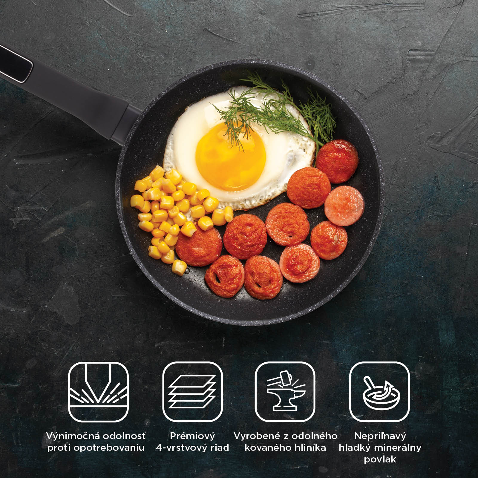 - 4-vrstvový kuchynský riad s nepriľnavým minerálnym povrchom na varenie s menším množstvom tuku a zdravšie jedlá.