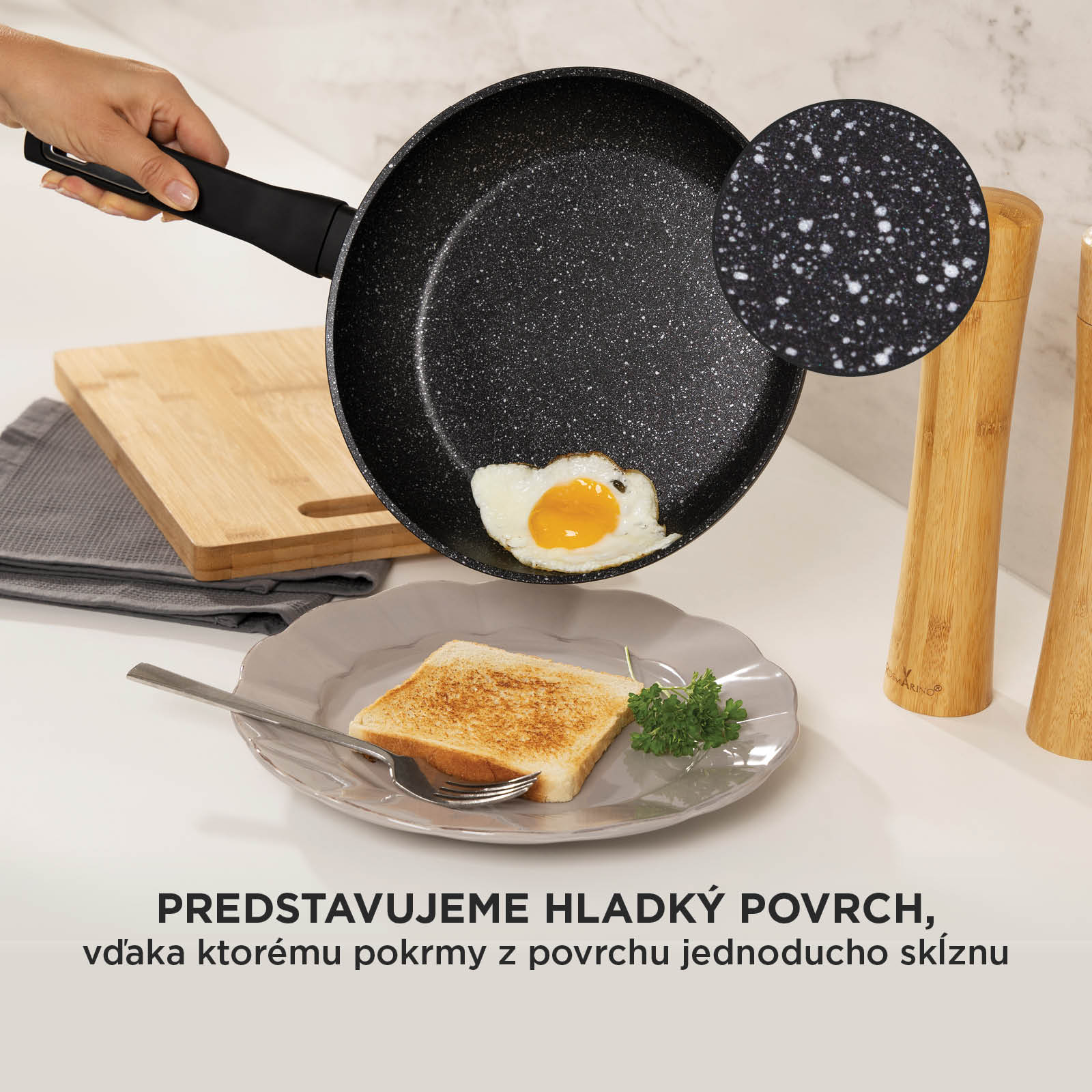 Pre zvýšenú pevnosť a odolnosť voči opotrebovaniu sme pridali pokročilý mramorový povlak s hladkými minerálnymi časticami, ktorý kuchynskému riadu zároveň dodáva jeho charakteristický elegantný vzhľad. Táto mramorová vrstva zaisťuje výnimočnú odolnosť voči poškriabaniu, takže môžete používať kovové kuchynské náčinie a riad umývať v umývačke riadu. Na zachovanie kvality povlaku však odporúčame používať drevené alebo silikónové kuchynské náčinie a ručné umývanie.
