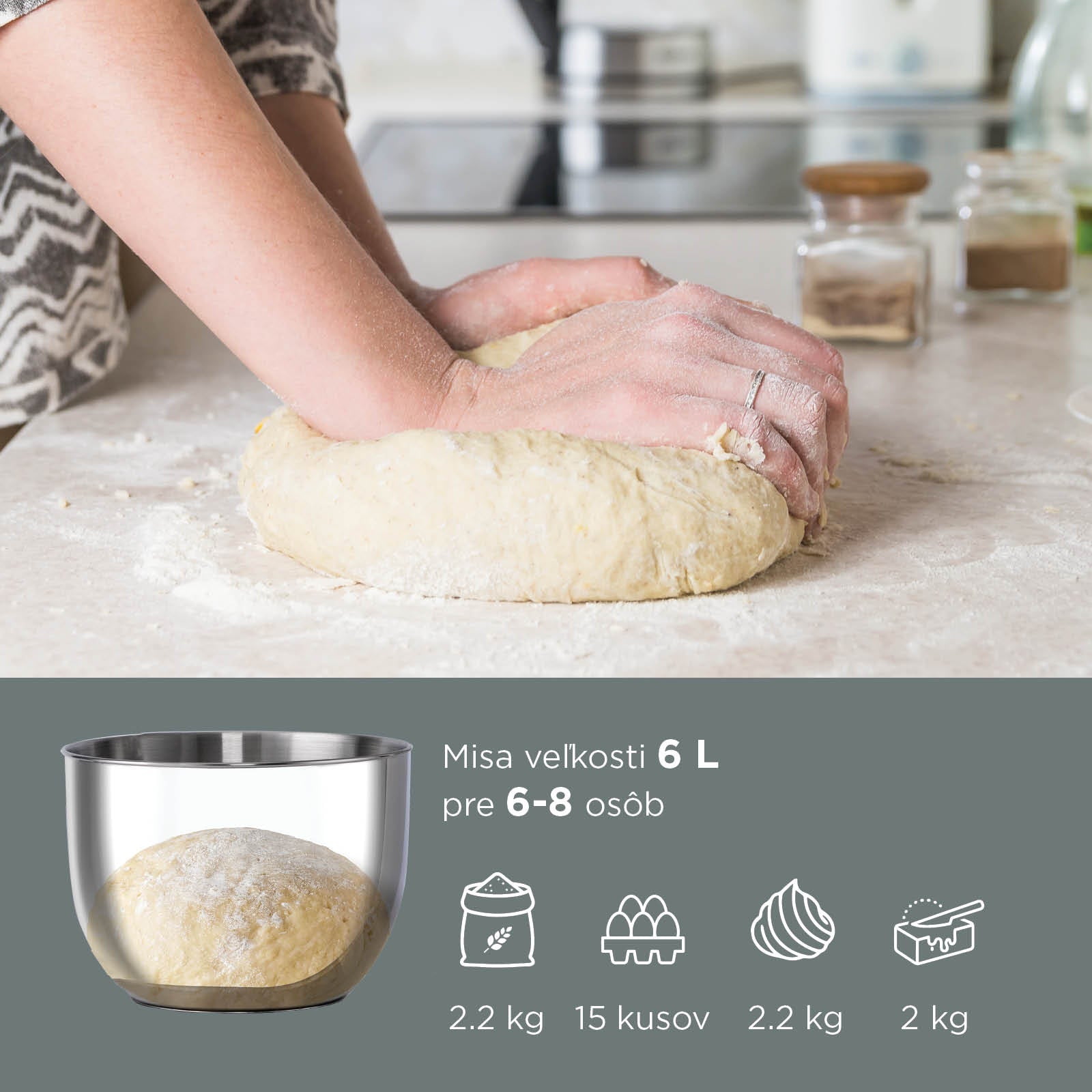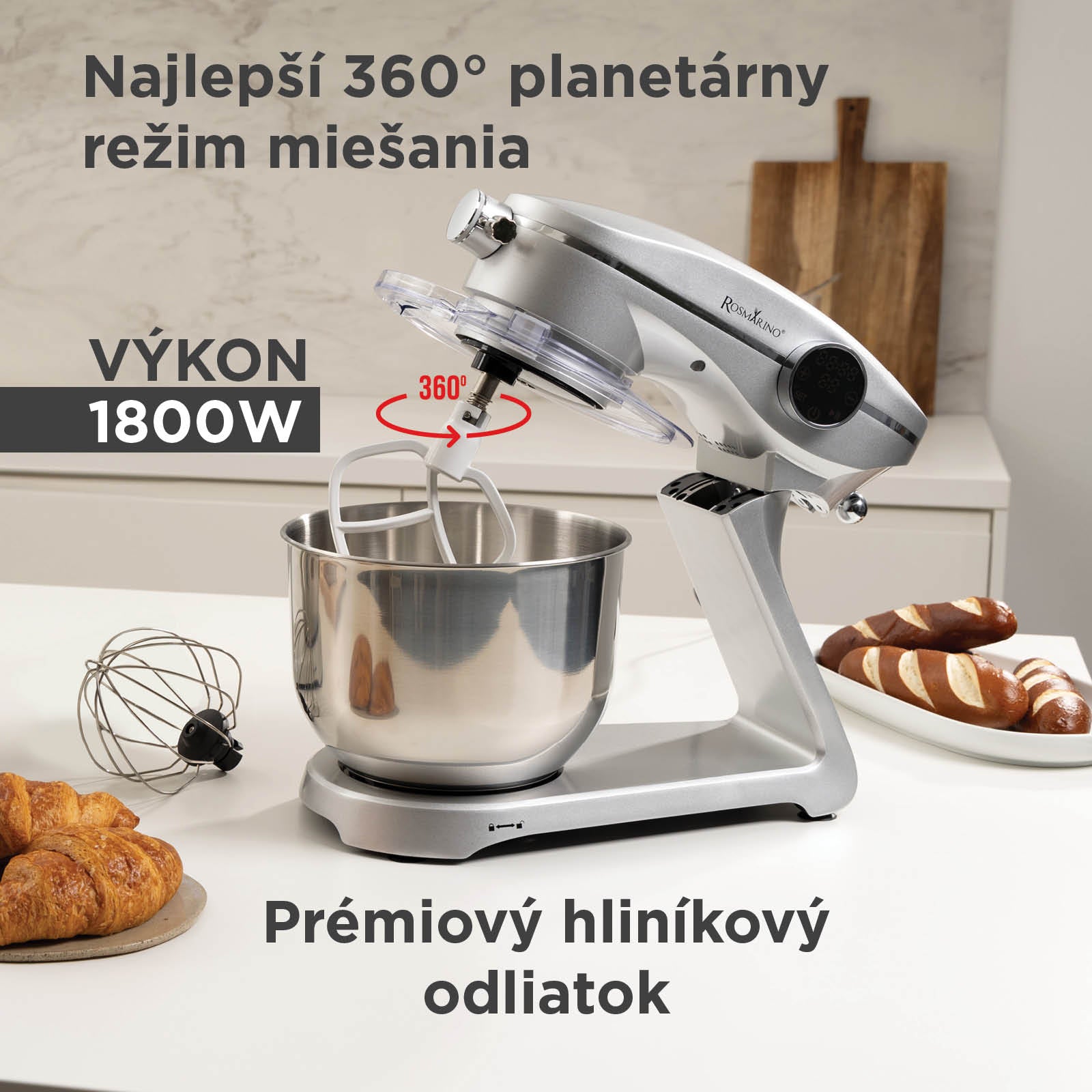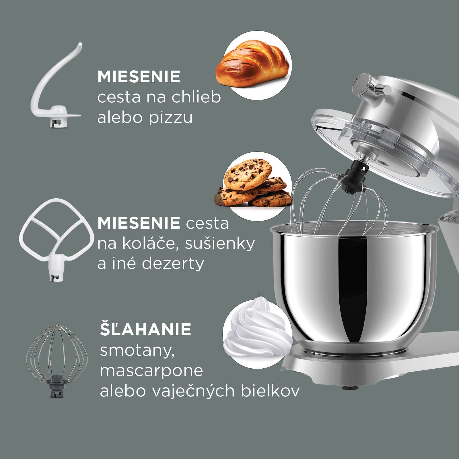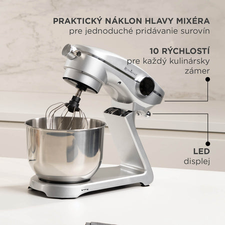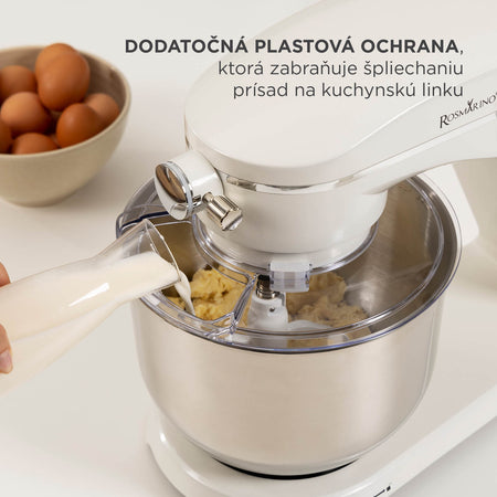 - Veľká 6-litrová miska a 3 dodatočné nadstavce ponúkajú všestranné použitie – od miesenia cesta po šľahanie bielkov.