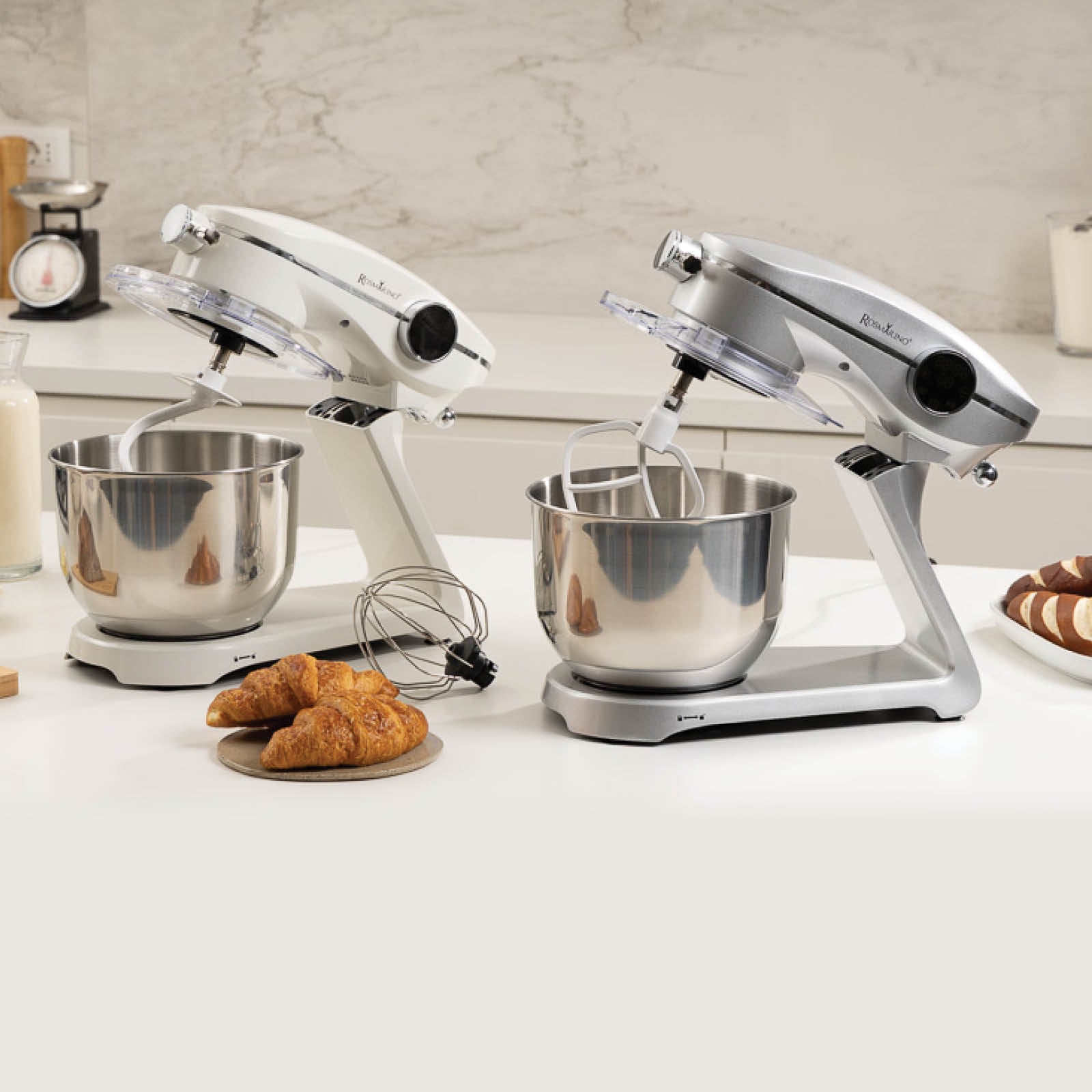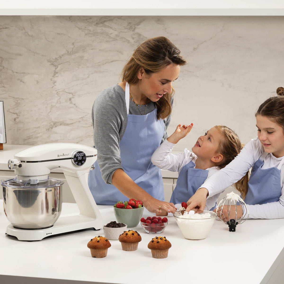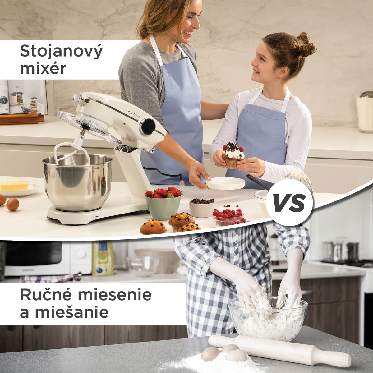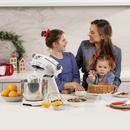 - Veľká 6-litrová miska a 3 dodatočné nadstavce ponúkajú všestranné použitie – od miesenia cesta po šľahanie bielkov.