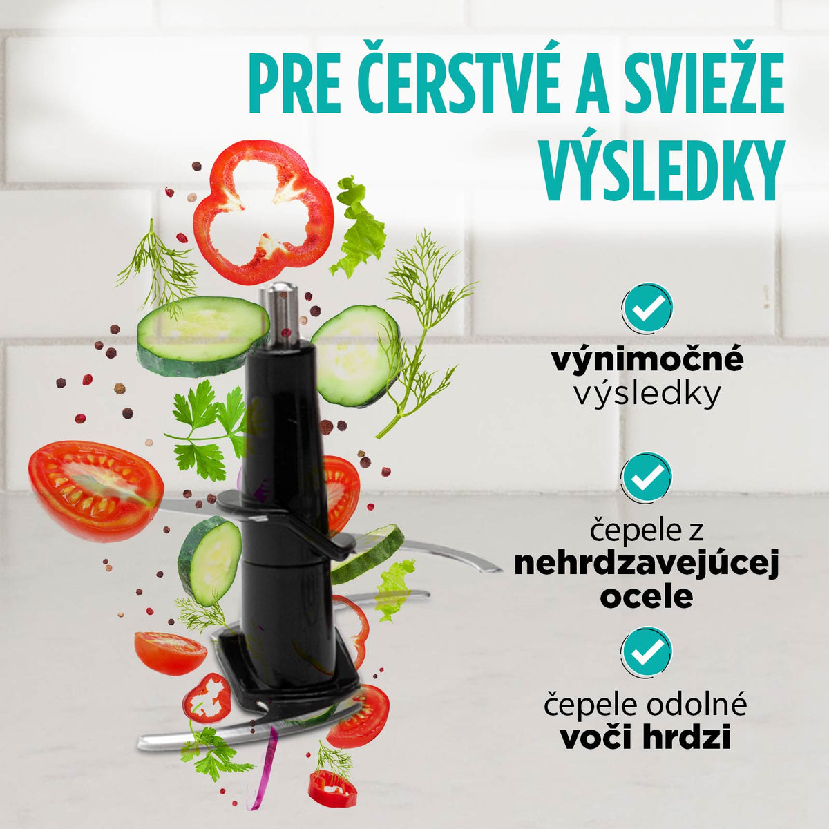 - Čepele z nehrdzavejúcej ocele pre dokonale nasekané potraviny bez zvyškov kúskov.