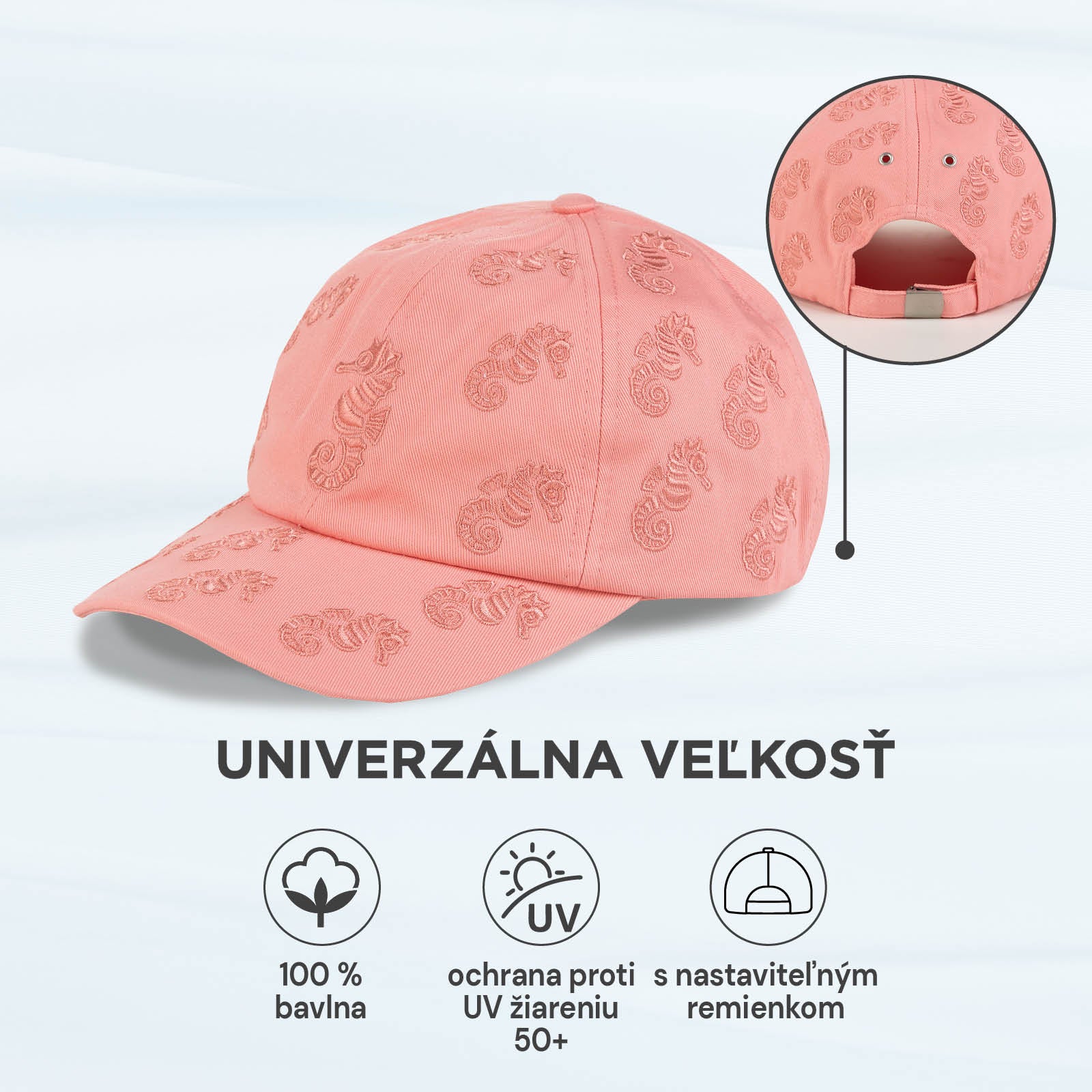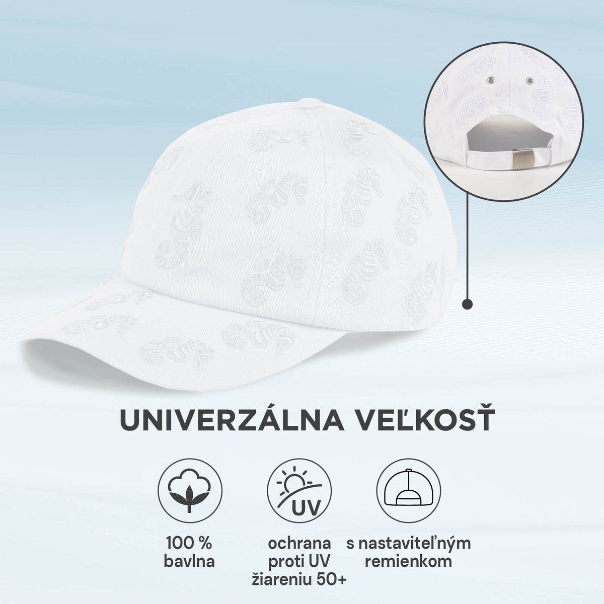 - Univerzálny dizajn s vyšívanými morskými koníkmi pre jedinečný vzhľad.