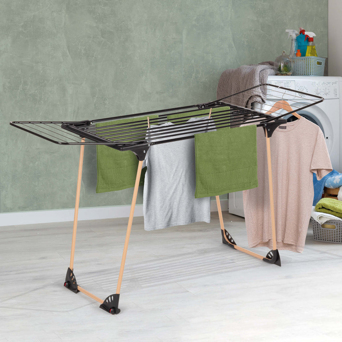Stojan sa dá postaviť alebo zložiť v priebehu niekoľkých sekúnd. Nohy majú ochranu proti pošmyknutiu a poškriabaniu, aby sa nepoškodila podlaha. Možno ho rýchlo a jednoducho predĺžiť alebo skrátiť podľa množstva a typu bielizne, ktorú periete.
