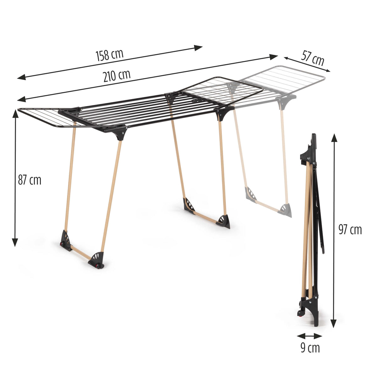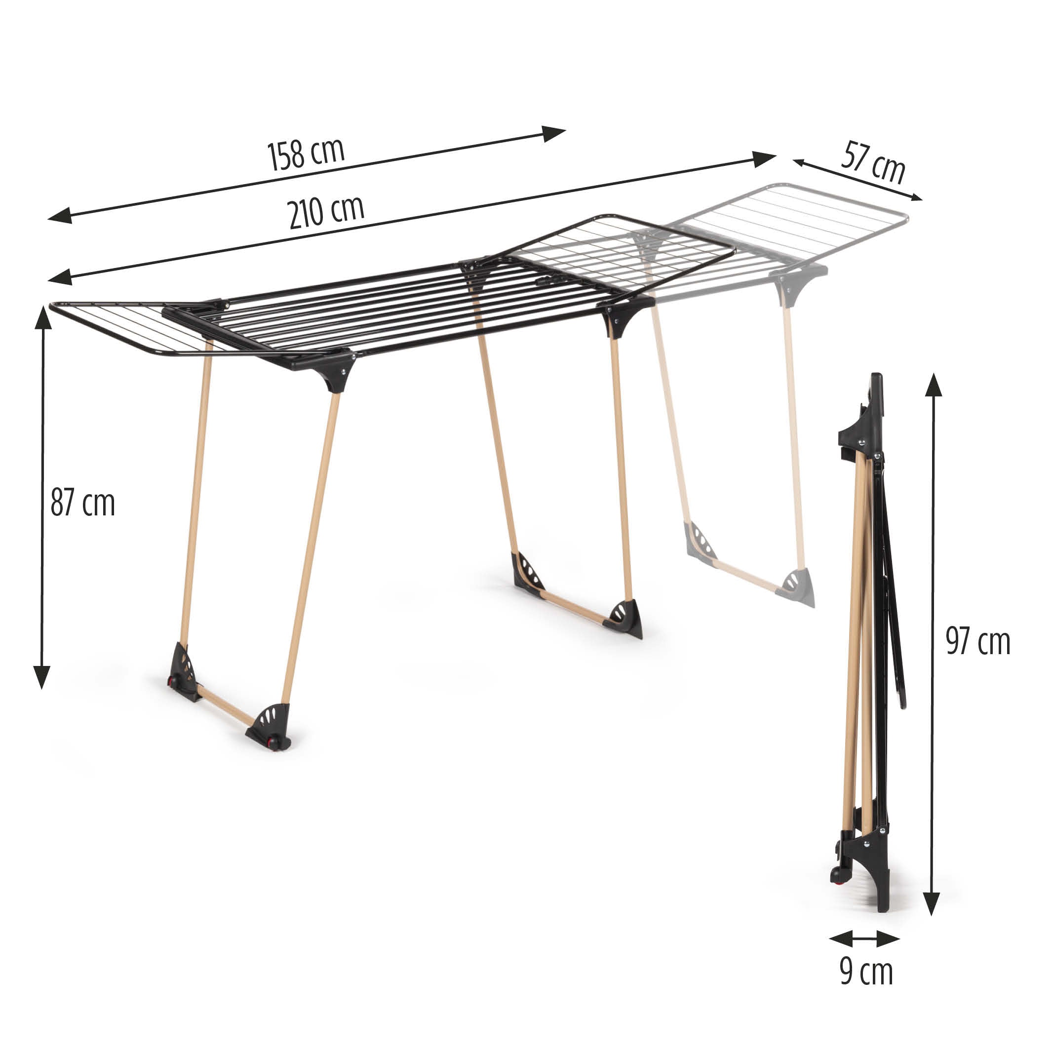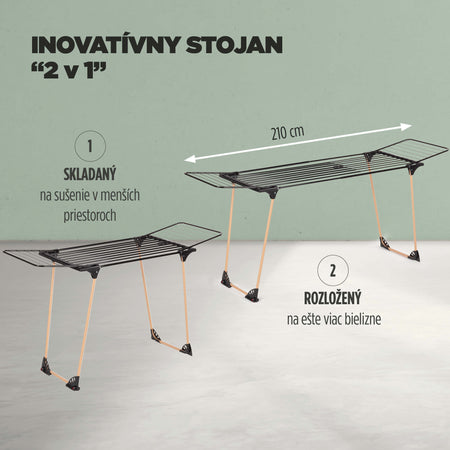 Stojan možno predĺžiť z 97 cm až na 210 cm, aby ste mohli sušiť aj väčšie kusy bielizne, napríklad prestieradlá a posteľnú bielizeň. Je vhodný najmä pre rodiny s viacerými deťmi, pretože umožňuje sušiť veľa kusov oblečenia.