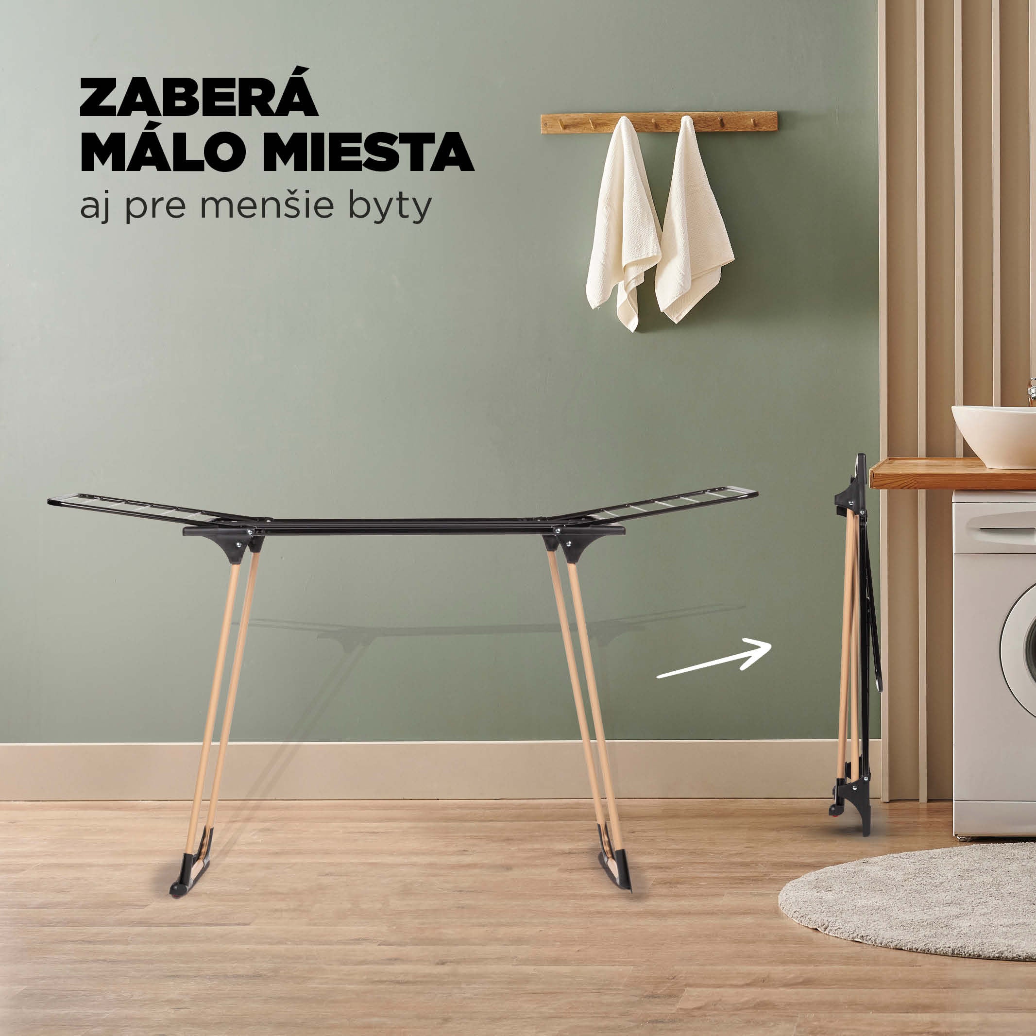 Prádlo sa suší prirodzenejšie na vešiaku ako v sušičke. To tiež zabraňuje vyblednutiu, roztiahnutiu alebo pokrčeniu oblečenia. Stojan sa skladá len na 9 cm, takže ho môžete ľahko uložiť za skriňu alebo pod ňu.
