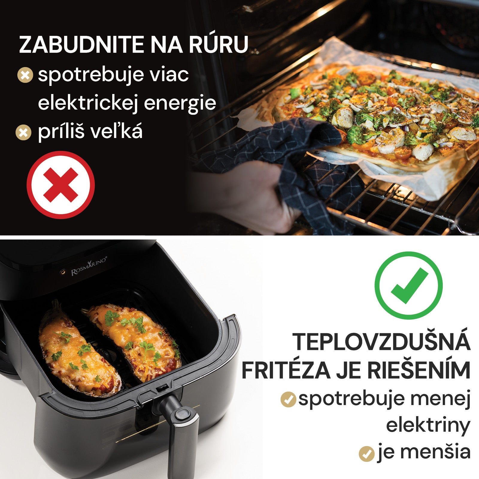 Technológia horúceho vzduchu vám umožňuje používať minimum oleja pri zachovaní chrumkavosti a lahodnej chuti vašich pokrmov. Horúci vzduch cirkuluje okolo jedla a ohrieva ho zo všetkých strán, aby sa zabezpečilo rovnomerné prepečenie. Pokrmy sú zvonka chrumkavé a zvnútra mäkké. Výhodou oproti rúre je, že vaša kuchyňa nebude plná nepríjemných pachov z varenia.