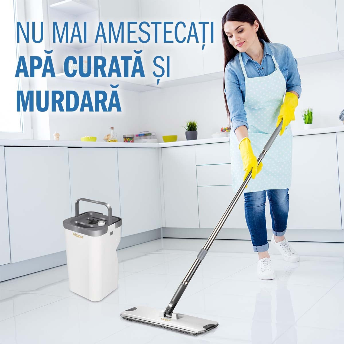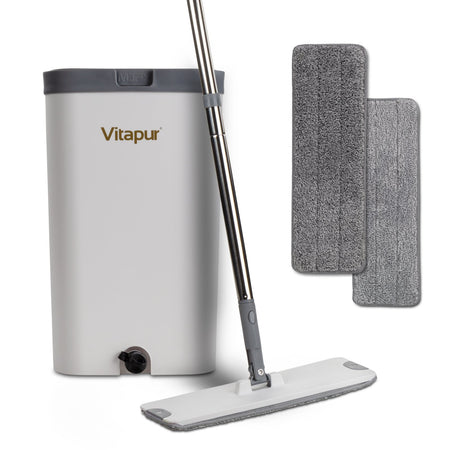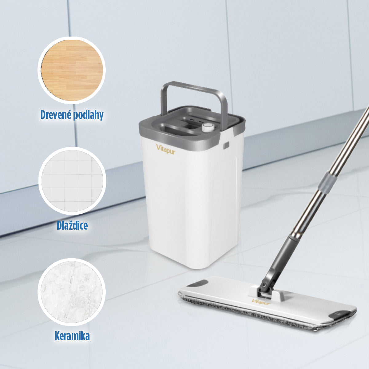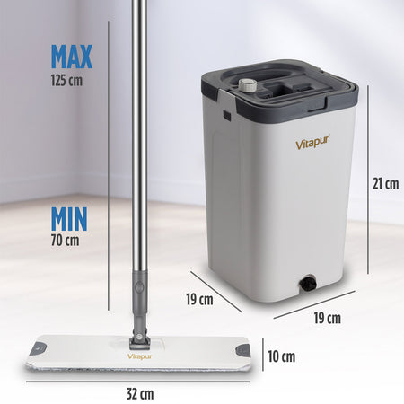 Štvordielna súprava na čistenie podláh Vitapur zmení váš pohľad na čistenie! Vedro s inovatívnym systémom oddeľovania špinavej a čistej vody umožňuje precízne čistenie od začiatku do konca! Rukoväť otočná o 360° je navrhnutá tak, aby uľahčila čistenie aj tých najťažšie prístupných miest. Vhodné na suché aj mokré čistenie s priloženými 2 náhradmi z mikrovlákna. Celú súpravu možno zložiť do mimoriadne malých rozmerov: 21 x 21 x 35,5 cm, ktoré sú ideálne na uloženie do skrine alebo na uskladnenie na dovolenke.