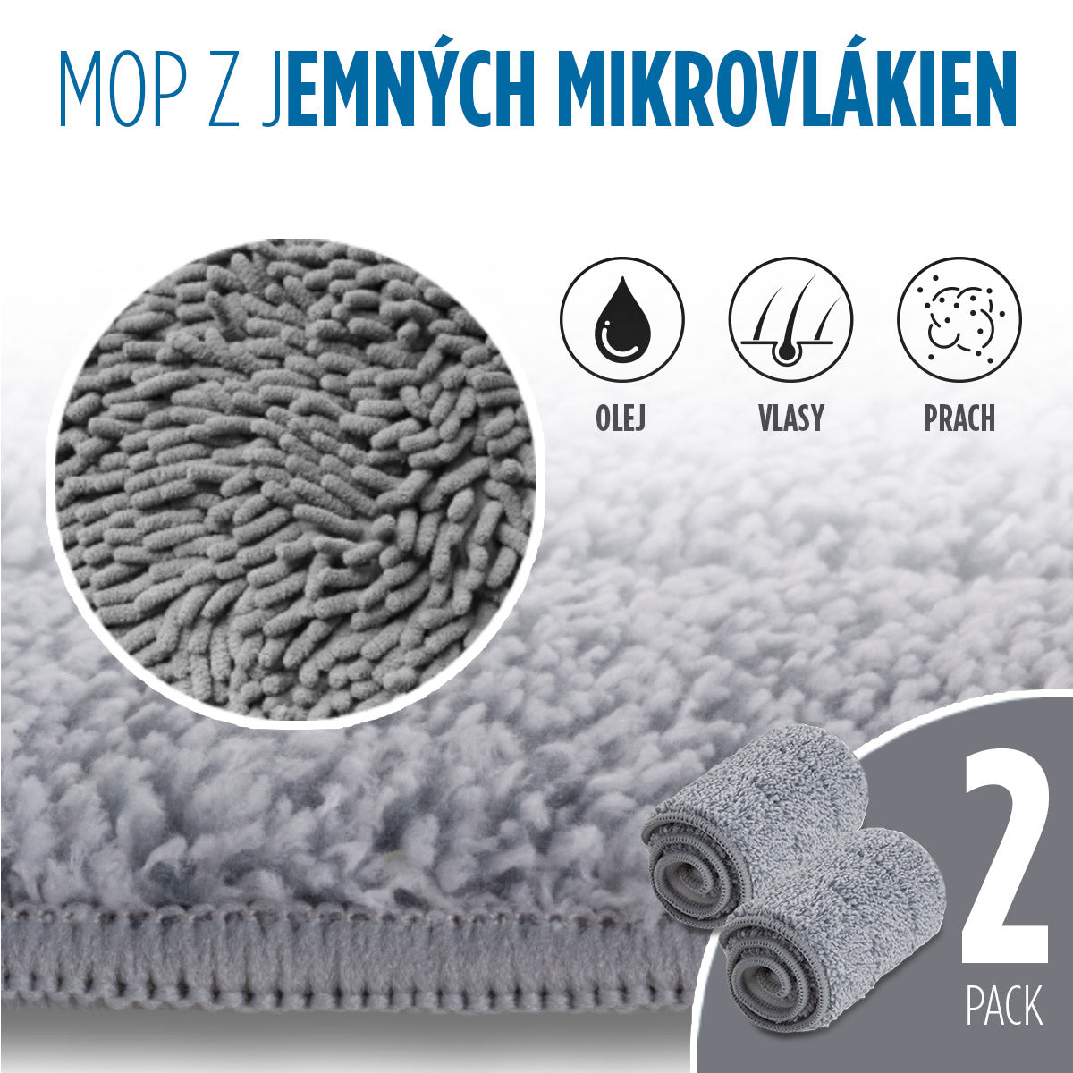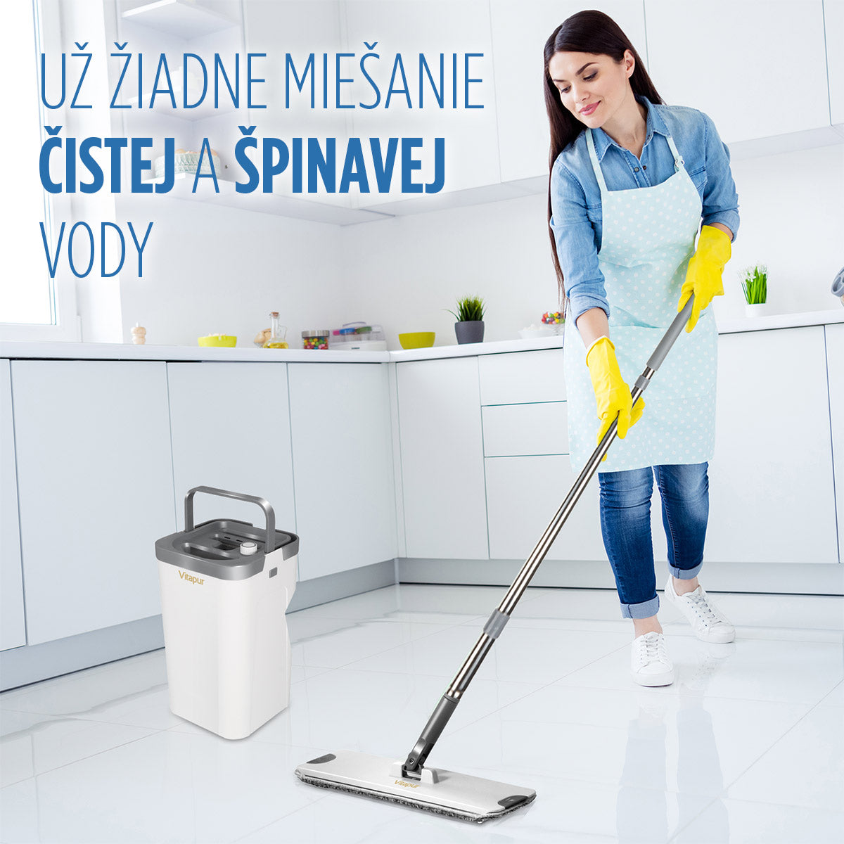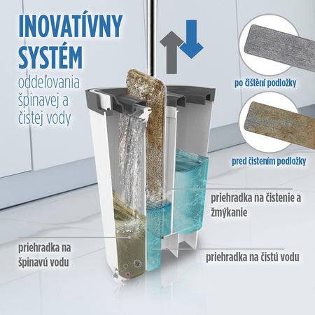 - Inovatívne vedro s dvoma priehradkami, podlahovým mopom a 2 náhradmi v balení.