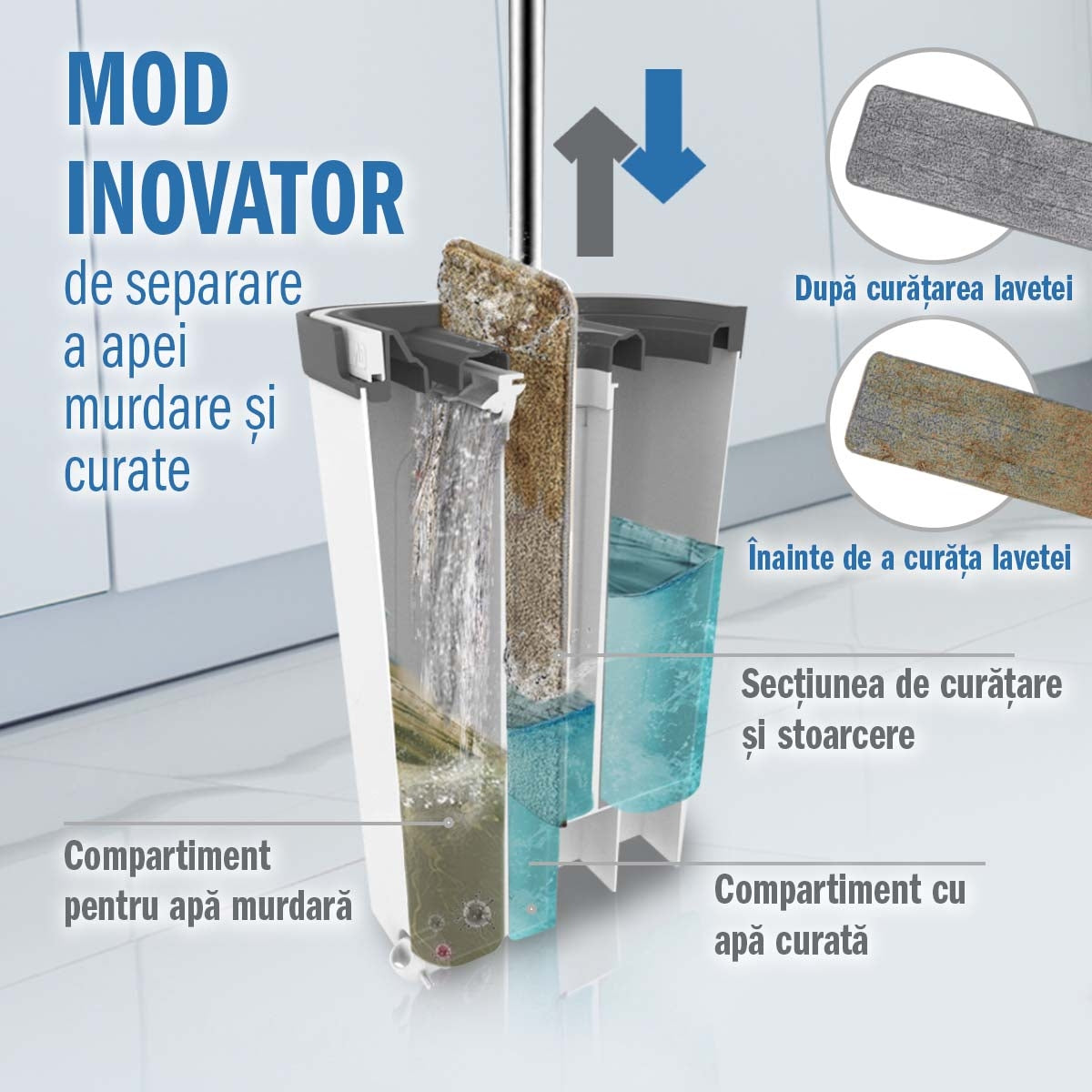 Inovatívny systém oddeľovania špinavej a čistej vody vám umožňuje jednoduché čistenie od začiatku až do konca. Vaša podlaha tak zostane čistá a vy ušetríte čas a vodu, pretože špinavá a čistá voda sú počas čistenia vždy oddelené. Rozlúčte sa s opakovaným prenášaním vedier! Vedro na čistenie má zabudovaný žmýkač, takže sa nemusíte počas čistenia zbytočne zohýbať, aby ste vyžmýkali náhradu. Náhradu môžete čistiť pomocou praktickej škrabky pripojenej k vedru.