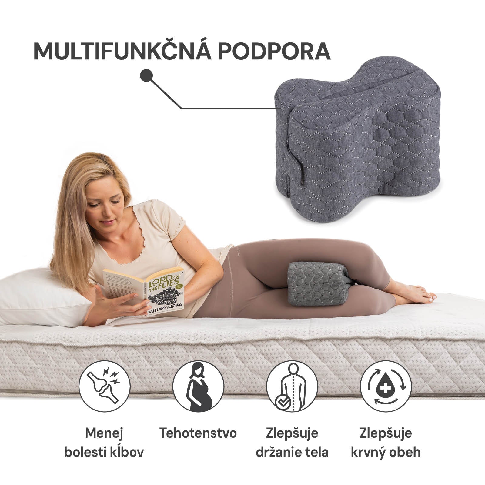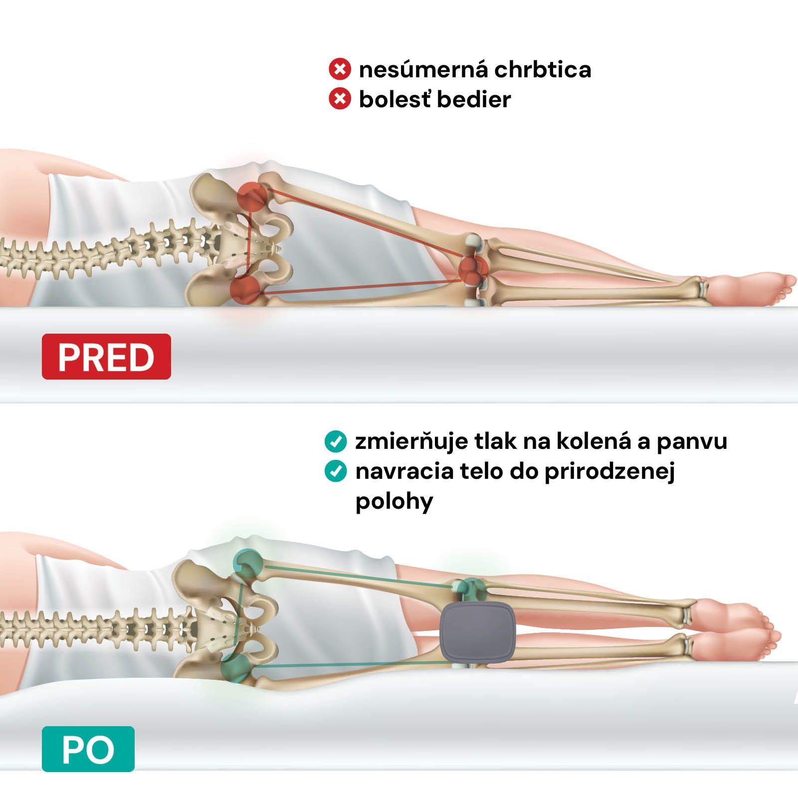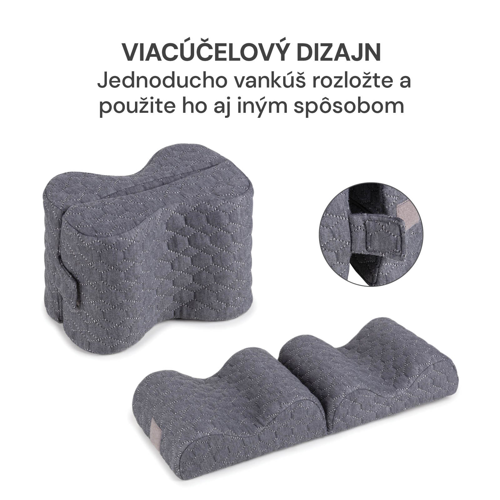 - Ergonomický vankúš zmierňuje tlak na kolená a panvu a udržuje telo v prirodzenej polohe.
