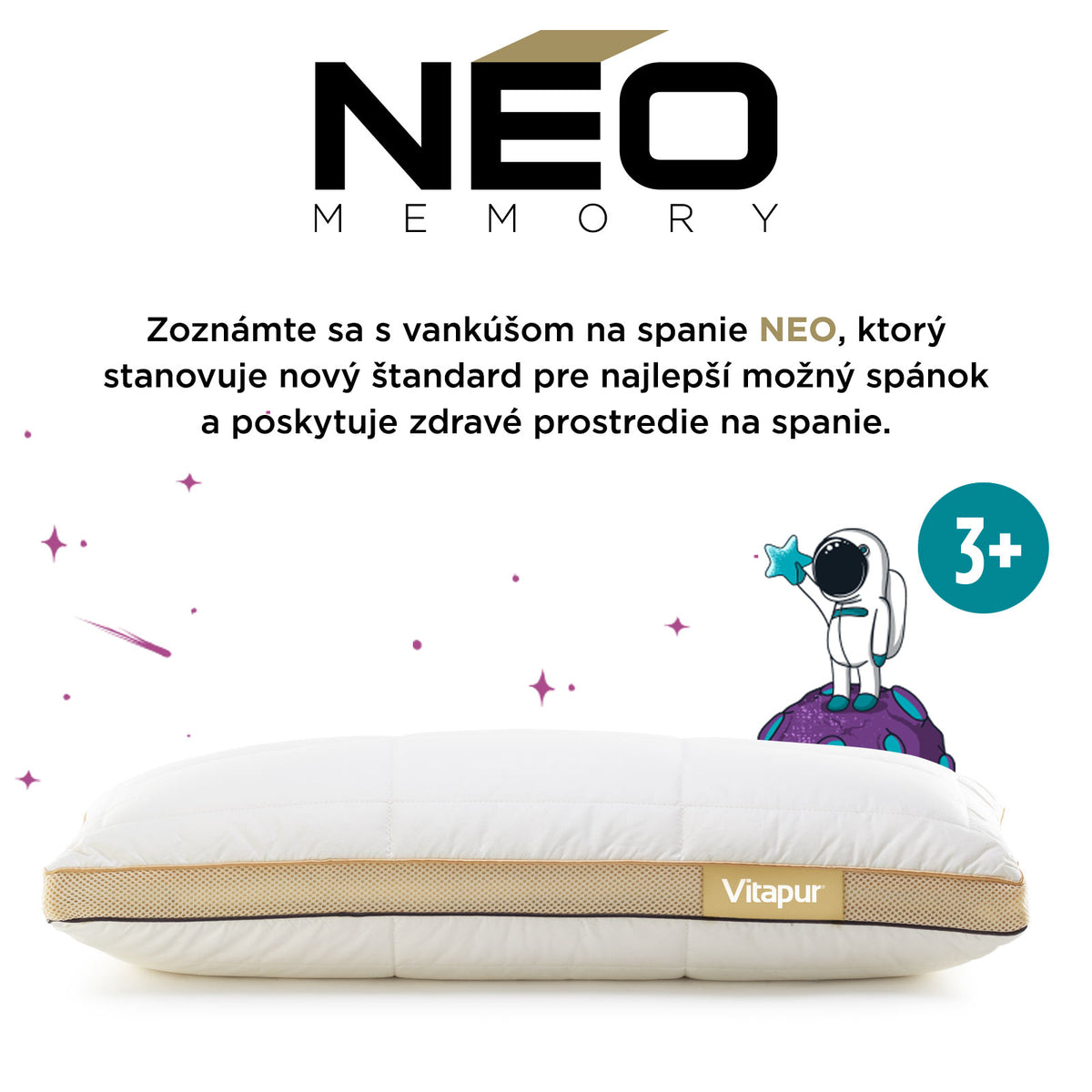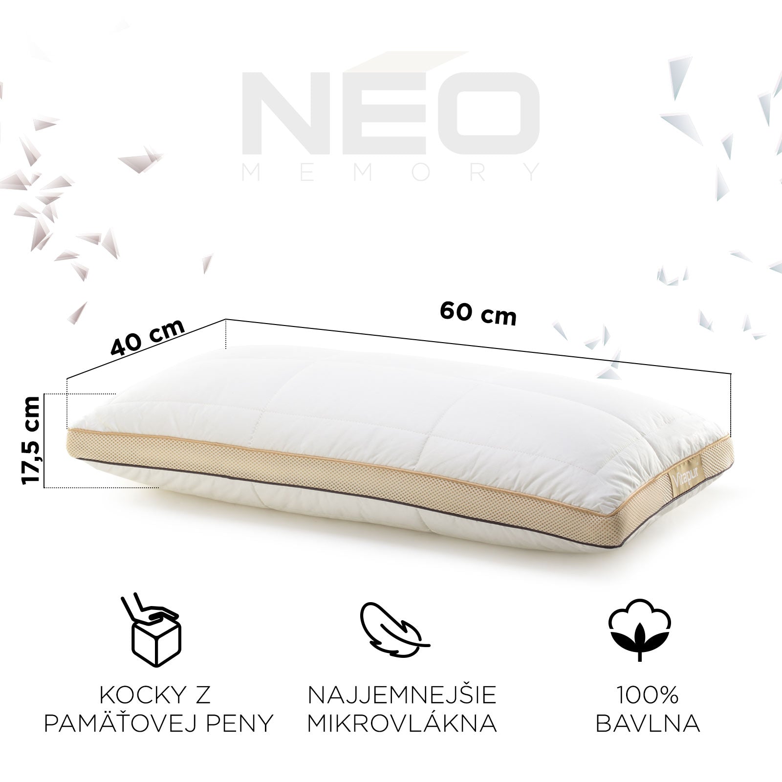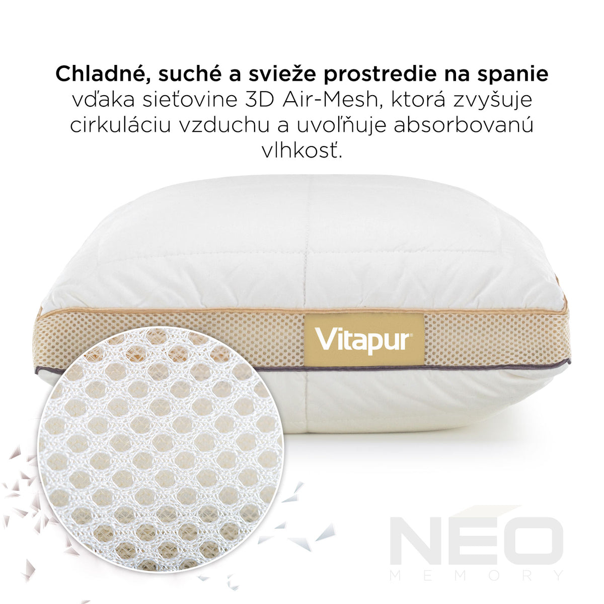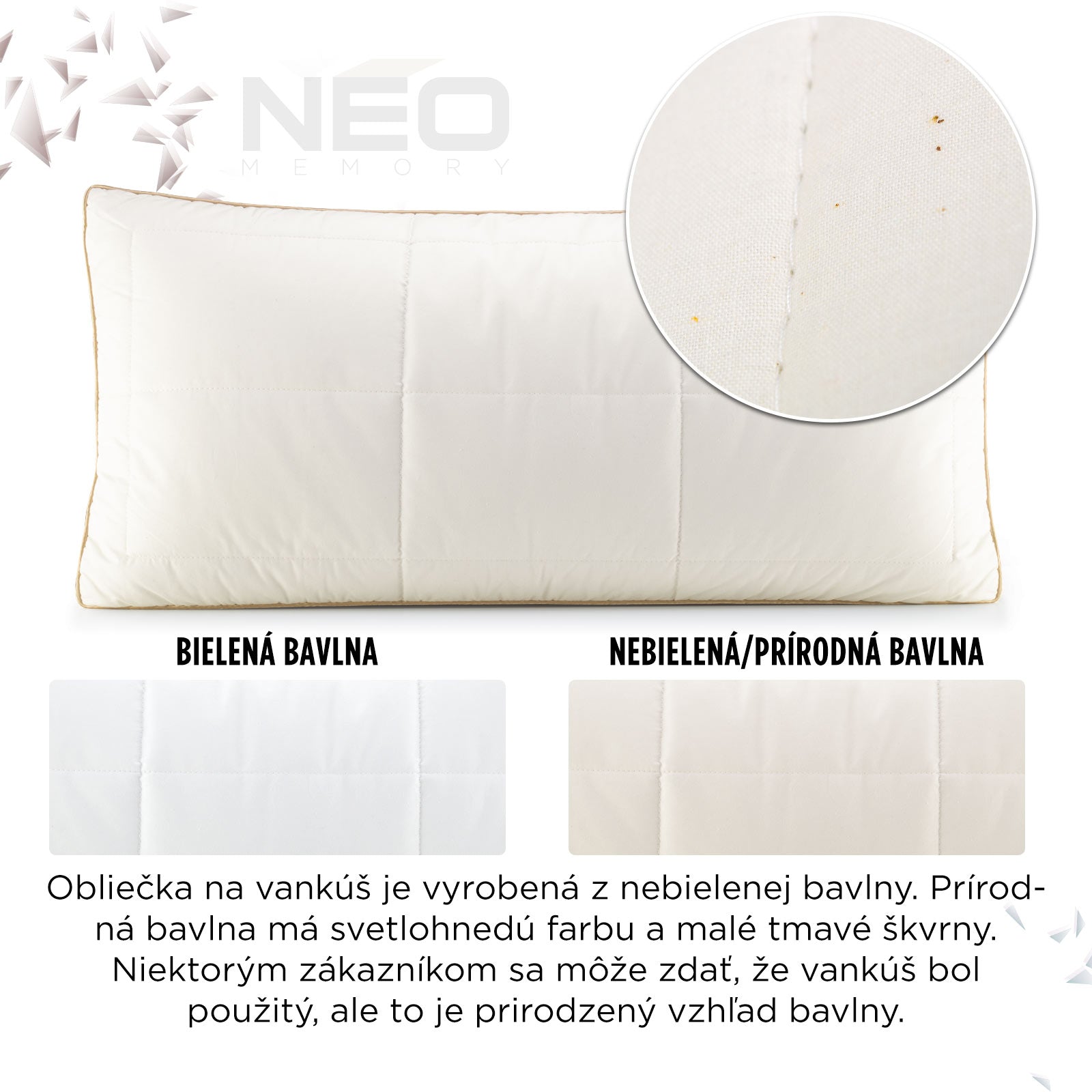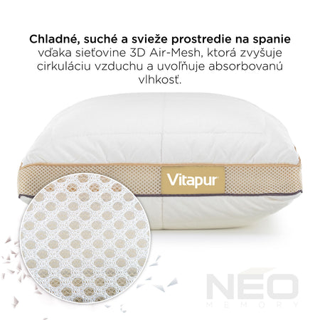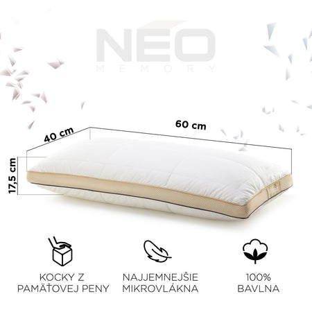 Inovatívna kombinácia kociek z pamäťovej peny a najjemnejších mikrovlákien ClimaSoft spoločne poskytujú vynikajúcu oporu pre váš krk. Pamäťová pena má dokonalé vlastnosti, ktoré sa prispôsobujú tlaku a zároveň na tento tlak aj spätne reagujú. Kocky z pamäťovej peny zaisťujú rovnomerné rozloženie tlaku a správnu oporu hlavy počas spánku, zatiaľ čo jemné mikrovlákna vám dodajú extra pocit jemnosti. Pamäťová pena je strihaná výhradne pre vankúš NEO. Práve vďaka jeho správnemu tvaru a obsahu pamäťových kociek získate tú správnu a želanú funkčnosť. Každé ráno sa tak začnete budiť spokojní a oddýchnutí.
