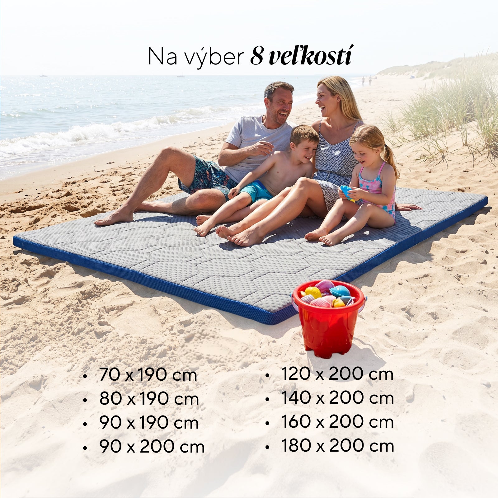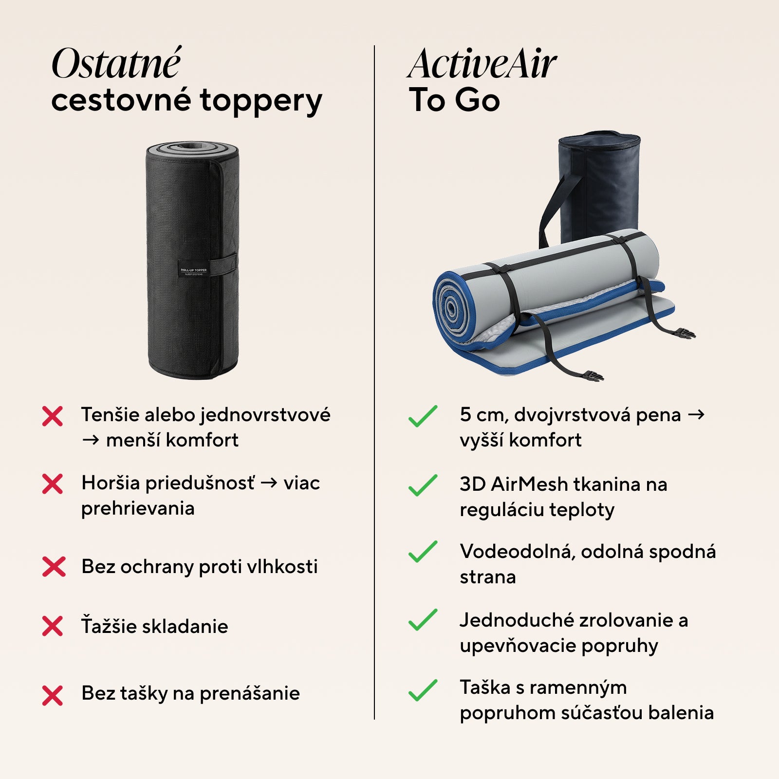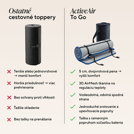 Cestovný vrchný matrac Vitapur ActiveAir To Go kombinuje 5 cm vrstvu polyuretánovej peny a pamäťovej peny a priedušné materiály pre lepší spánok na akomkoľvek povrchu.
