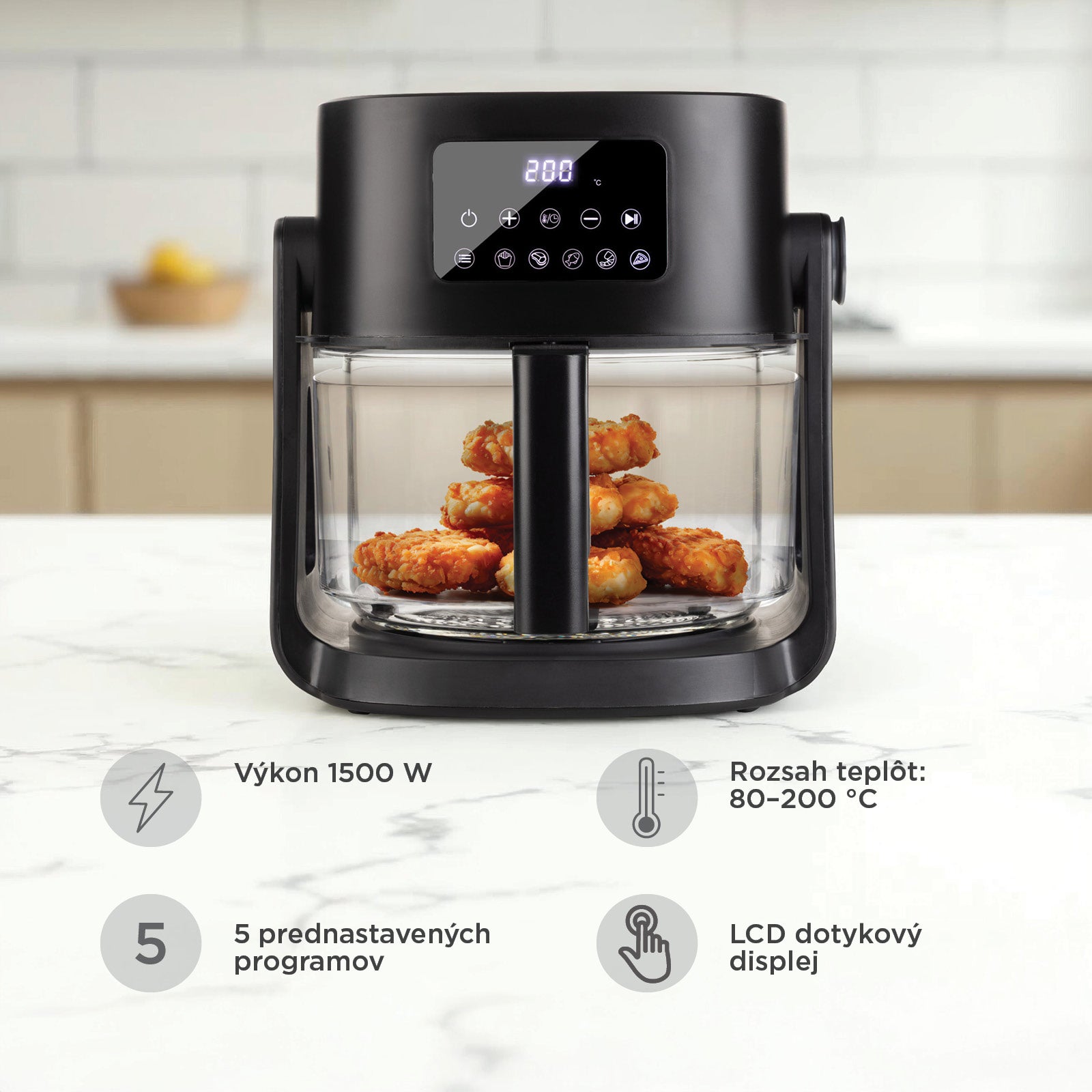 Vychutnajte si chrumkavé hranolčeky, kuracie mäso a dokonca aj dezerty pripravené až o 85 % menej oleja ako pri tradičnom vyprážaní. Sklenený kôš vám umožní sledovať prípravu jedla a zakaždým zabezpečí dokonalé výsledky. Ideálna voľba pre chutné jedlá bez počítania kalórií..