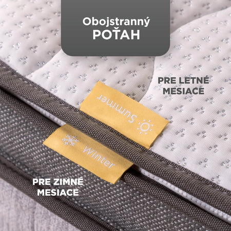 - Odnímateľný sezónny textilný vrchný matrac so zimnou a letnou stranou reguluje teplotu a zabezpečuje príjemné prostredie na spánok po celý rok.