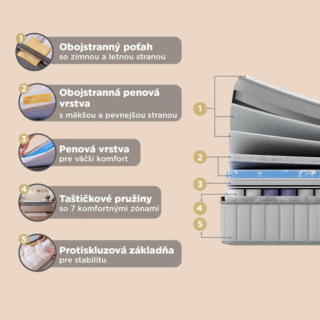 - 7-zónové jadro z taštičkových pružín poskytuje cielenú podporu a úľavu od tlaku po celej dĺžke tela pre vyššiu kvalitu spánku.