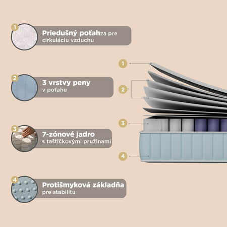 - Priedušný poťah zabezpečuje príjemne svieže prostredie na spanie.