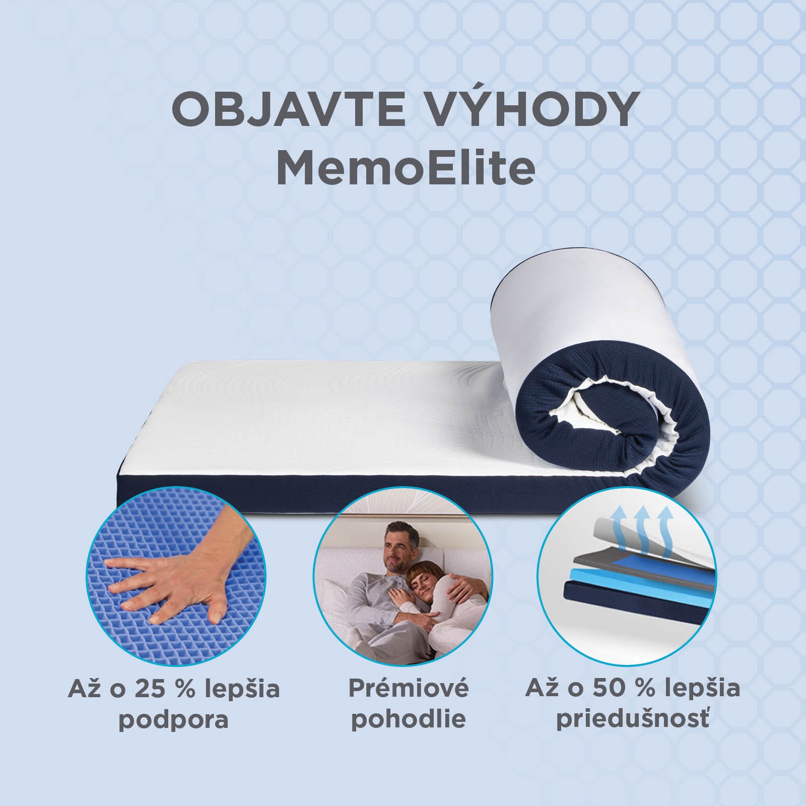 - Inovatívny materiál MemoGel ponúka až o 25 % lepšiu oporu a je o 50 % priedušnejší než bežná pamäťová pena.