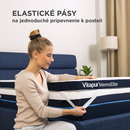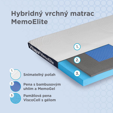 Hybridný vrchný matrac Vitapur MemoElite s výškou 8 cm je ideálnym riešením na zlepšenie komfortu na vašom starom matraci, pohovke alebo počas cestovania či kempovania. Inovatívny materiál MemoGel okamžite reaguje na pohyby tela a poskytuje až o 25 % lepšiu oporu než bežná pamäťová pena. Vďaka sieťovanej štruktúre účinne odvádza prebytočné teplo z tela a ponúka až o 50 % lepšiu priedušnosť. Svieže a suché prostredie na spanie zabezpečuje aj gél vo ViscoCell pamäťovej pene, ktorý absorbuje teplo a reguluje teplotu, čím zabraňuje poteniu počas spánku. Pamäťová pena poskytuje individuálnu oporu v každej polohe spánku, uvoľňuje tlak a udržiava chrbticu v optimálnej polohe pre bezbolestný spánok. Vrchný matrac obsahuje aj bambusové uhlie, ktoré má antibakteriálne vlastnosti a pomáha udržiavať povrch na spanie čistý a hygienický. Pre pohodlný, svieži a zdravý spánok je MemoElite tou správnou voľbou!
