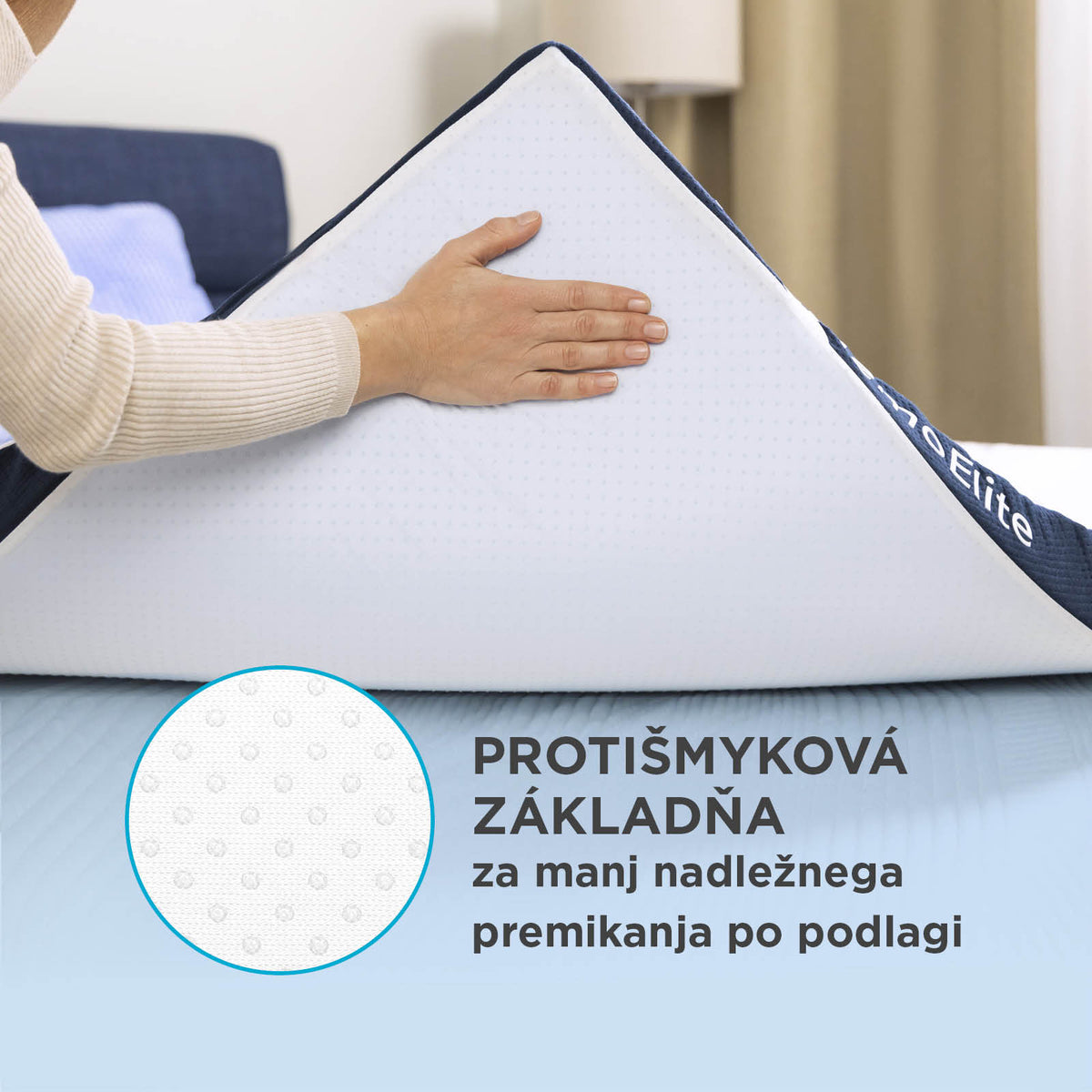 Vďaka výške 8 cm je vrchný matrac výborným riešením na zlepšenie komfortu staršieho matraca. Môže sa použiť aj ako prístelka na pohovke, na podlahe v stane alebo počas cestovania. Spodná strana má protišmykovú úpravu a štyri upevňovacie pásky, ktoré zabraňujú posunu počas používania, takže váš spánok bude pokojný a bezstarostný.