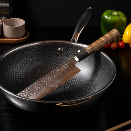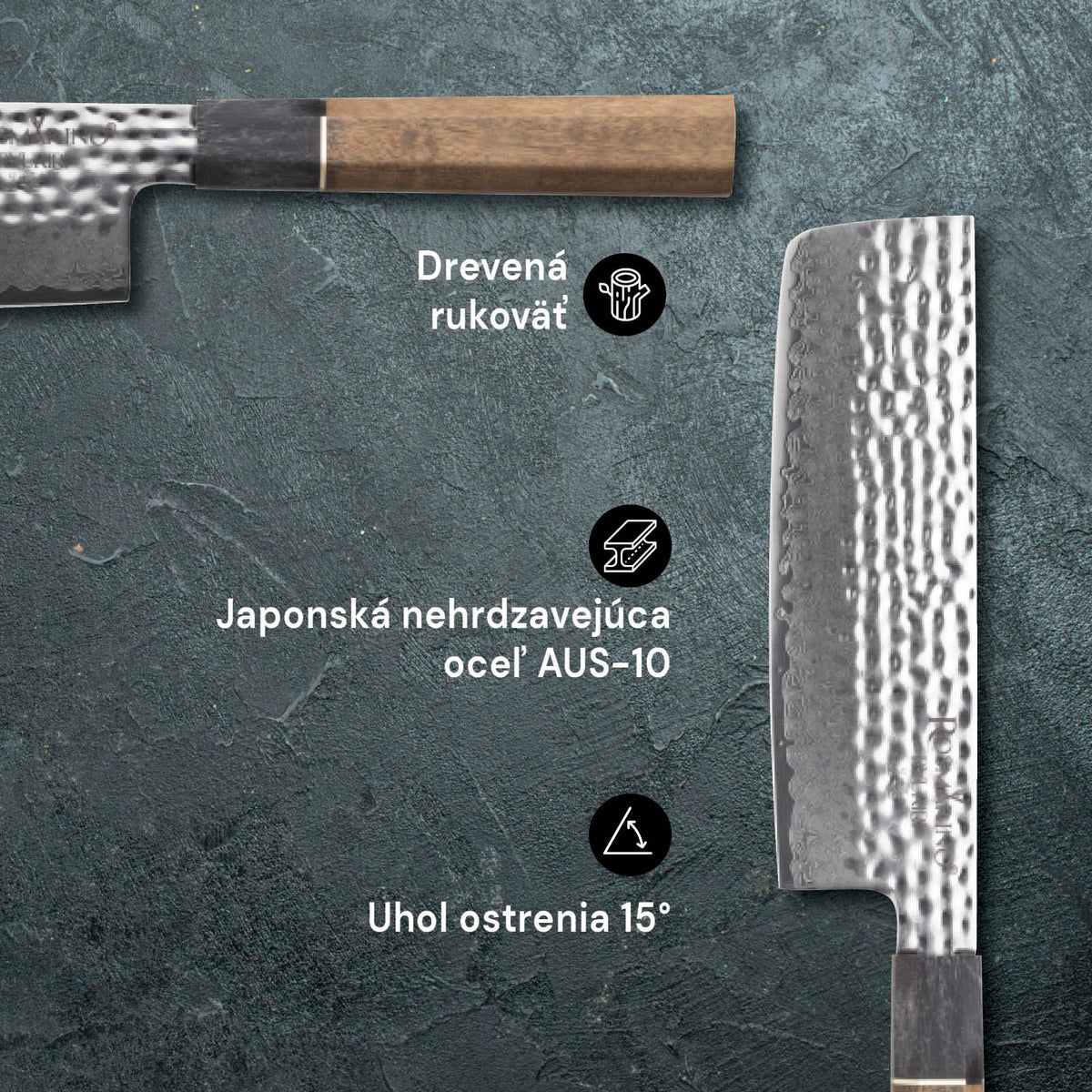 Čepeľ kuchynského noža je vyrobená z nehrdzavejúcej ocele AUS-10 z japonskej kovárne AICHI, ktorá je známa svojou kvalitou. Prvotriedny vzhľad noža dotvára výrazný damaškový vzor a drevená rukoväť, ktorá odráža japonský dizajn.