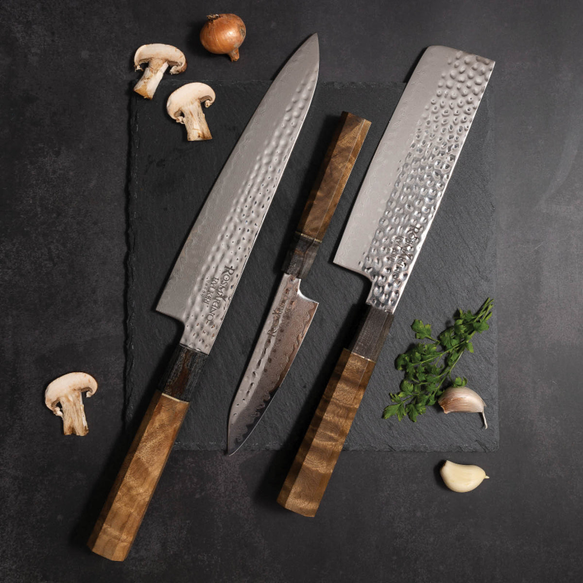 Kombinácia prémiovej nerezovej ocele, damaškového vzoru a drevenej rukoväte.