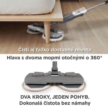 - Hlava s dvomi 360° otočnými mopmi sa dostane aj do najťažšie prístupných kútov pod nábytkom a do rohov.