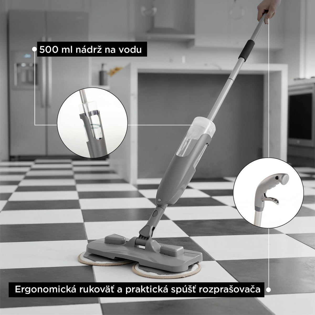 Koniec namáčania a žmýkania handier. Ručný rozprašovač umožňuje aplikovať presne toľko tekutiny, koľko potrebujete, a presne tam, kde to potrebujete. Vďaka nádobe na vodu s objemom 500 ml môžete jedným naplnením vyčistiť viac miestností, čo vám ušetrí čas aj vodu.
