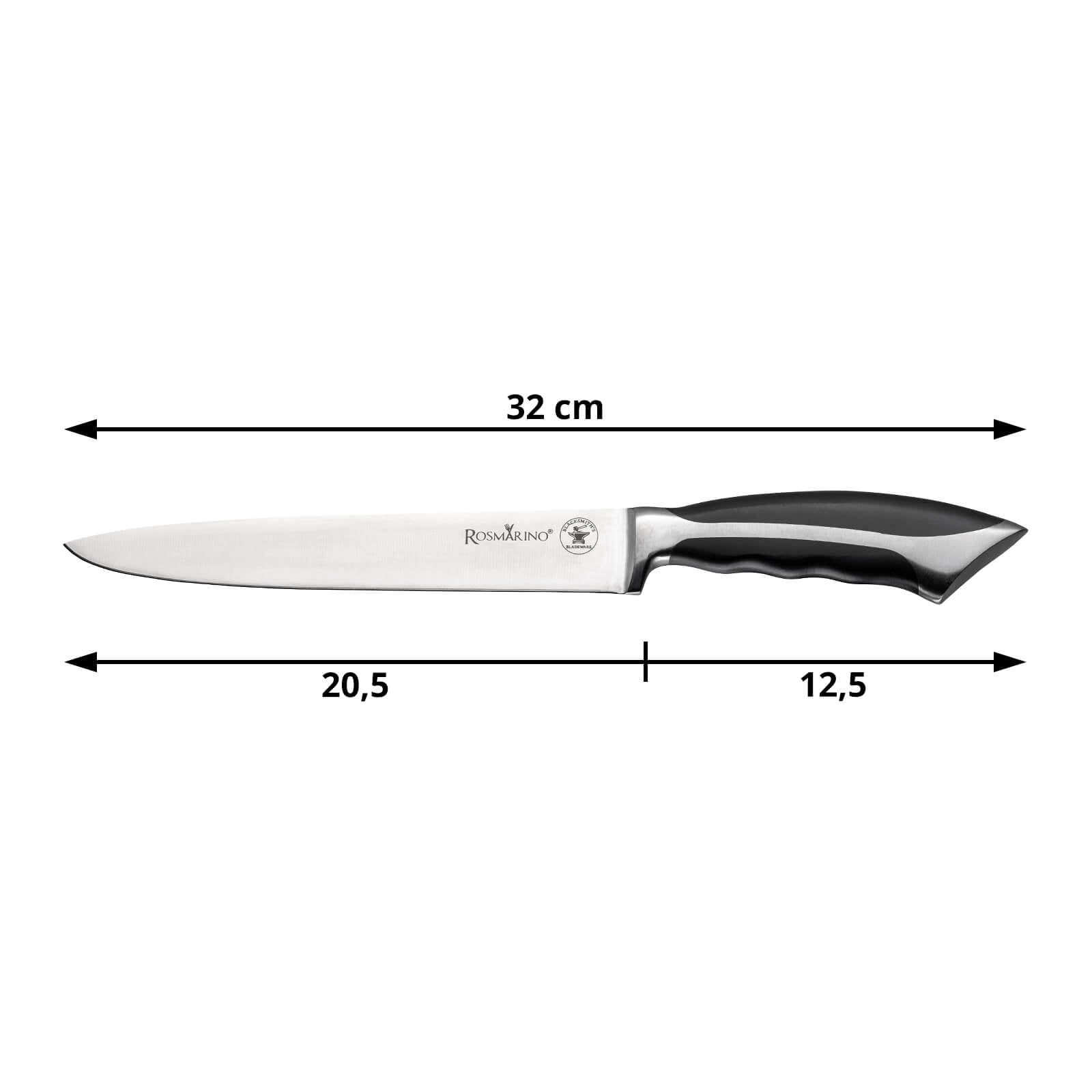 Perfektný kuchynský nôž Rosmarino Blacksmith's Slicer pre všetkých kuchárskych majstrov aj začiatočníkov! Tento väčší nôž je so svojím tvarom ideálny na krájanie rôznych potravín. Čepeľ je vyrobená z nehrdzavejúcej ocele nemeckej kvality, odolná rukoväť je z vysoko kvalitného vstrekovaného plastu ABS, čo umožňuje maximálnu záťaž. Profesionálna ostrosť vám pomôže rýchlo a presne nakrájať potraviny na tenké plátky, pričom dĺžka čepele umožňuje rýchle a efektívne krájanie bez námahy. Výhodou noža je obojstranne ručne brúsená čepeľ pod uhlom 15° pre dlhotrvajúcu ostrosť a odolnosť. Vďaka špeciálnemu brúseniu je nôž dodatočne odolný proti korózii, hrdzi a škvrnám. Nôž sa jednoducho čistí pod tečúcou vodou s trochou saponátu.
