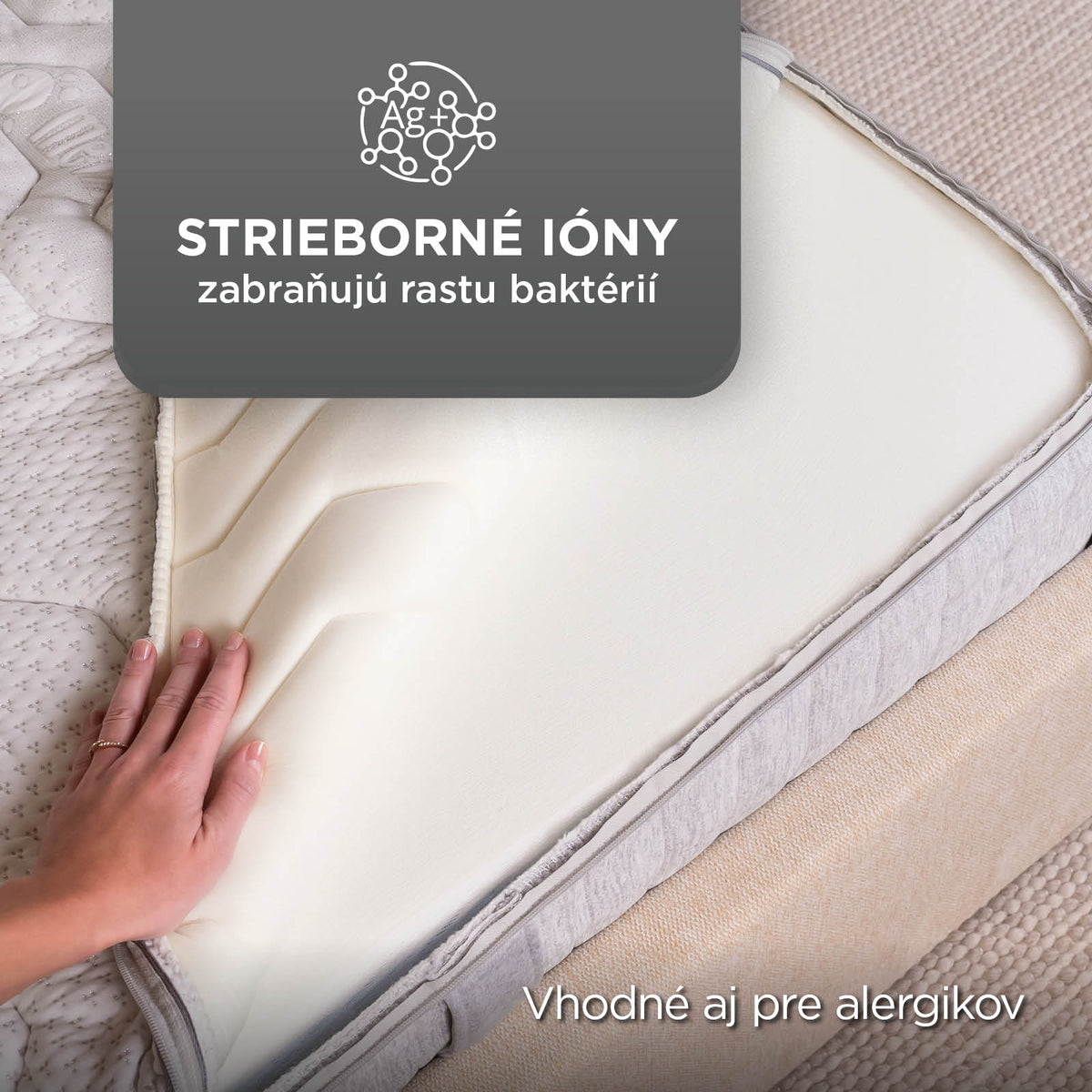 - Strieborné ióny v poťahu pomáhajú zmierňovať príznaky alergií a citlivosti pokožky vďaka antibakteriálnemu účinku.