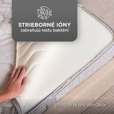Poťah je napustený striebornými iónmi, ktoré majú antibakteriálne vlastnosti. Tým, že pomáhajú predchádzať vzniku baktérií, roztočov a plesní, znižujú alergénnu záťaž matraca a podráždenie pokožky. Výborná voľba pre zdravý spánok, najmä pre alergikov a ľudí s citlivou pokožkou.