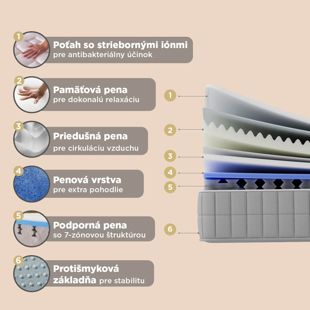 - Antibakteriálne strieborné ióny v poťahu poskytujú čisté, svieže prostredie na spanie.