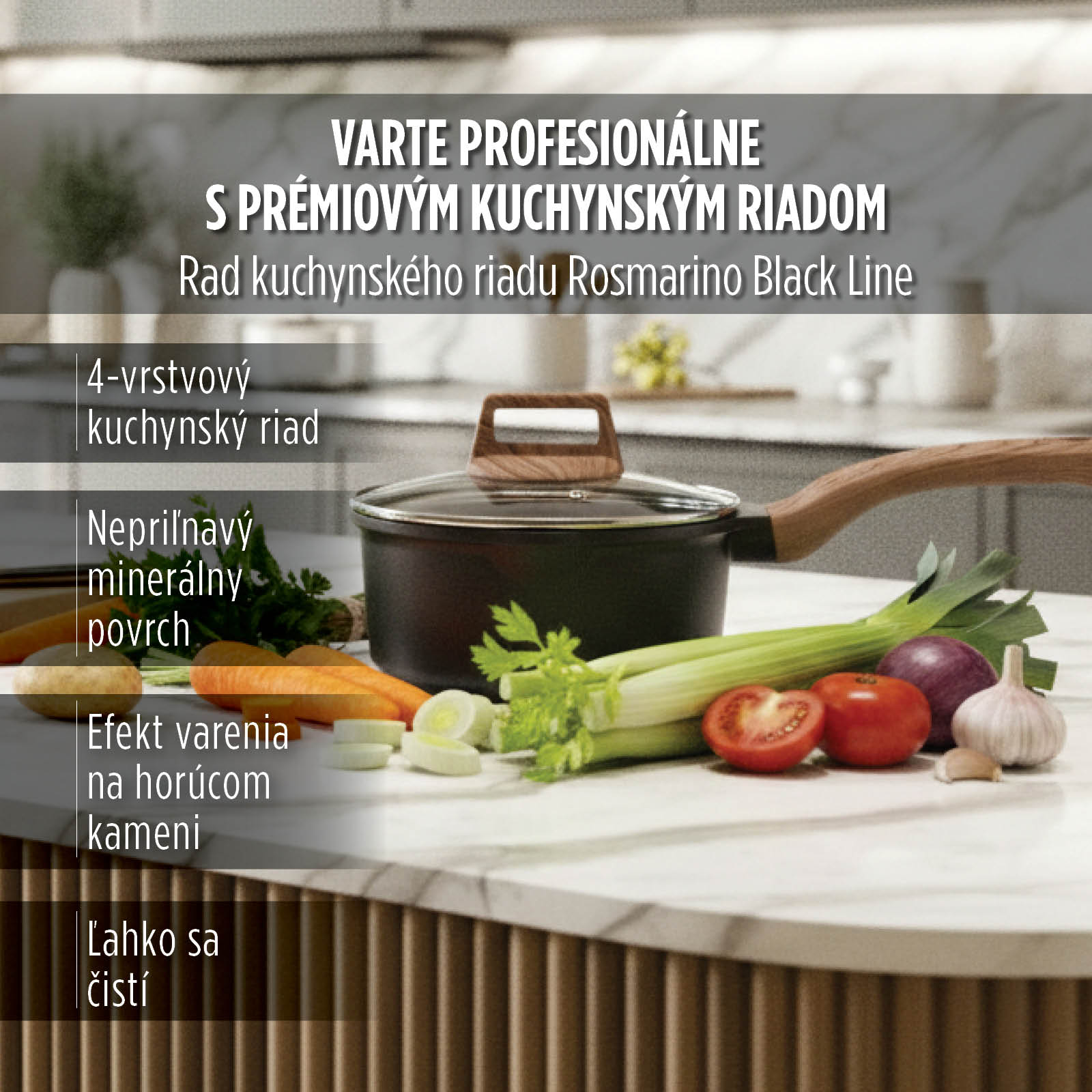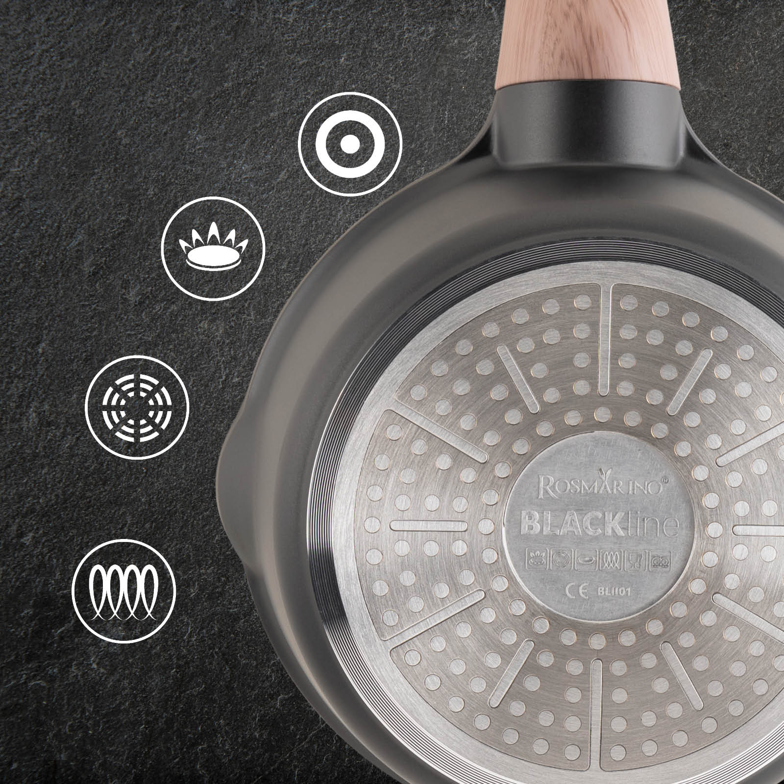 Rajnica s pokrievkou Black Line II s priemerom 18 cm patrí do prémiového radu s inovatívnym a technologicky prepracovaným minerálnym povrchom vyvinutým v Nemecku. Nepriľnavý minerálny povrch umožňuje prirodzené varenie a pečenie s nízkym obsahom tuku. Jedlo si tak zachováva všetky vitamíny a minerály, ktoré telo potrebuje pre zdravý životný štýl. Je vhodný na všetky varné dosky vrátane indukcie a ľahko sa čistí, pretože ho možno umývať v umývačke riadu. Celý riad Black Line II je založený na viacvrstvovej konštrukcii, ktorá zaručuje dlhú životnosť, vysokú odolnosť a trvácnosť.