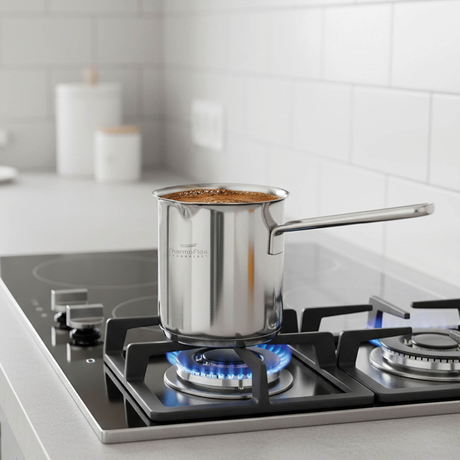 Oceľová kanvica na kávu Pour&Cook II s objemom 600 ml je vyrobená z nezničiteľnej ocele 18/10 s 3-vrstvovým dnom, ktoré umožňuje rýchly a rovnomerný ohrev a kratší čas varenia. Technológia ThermoFlow zabezpečuje vynikajúce rozloženie tepla po celom povrchu hrnca na rovnomerné varenie. Je vhodná na všetky varné dosky vrátane indukcie a ľahko sa čistí, pretože je vhodná do umývačky riadu.