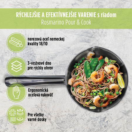 Na presné odmeranie množstva nepotrebujete špeciálnu odmerku, pretože odmerná stupnica je už vyrytá na vnútornej strane hrnca. Už žiadne vylievanie a špliechanie, pretože pokrievka má na oboch stranách odtokové otvory a zaoblené okraje, čo uľahčuje vylievanie bez toho, aby ste pokrievku museli dvíhať. Ergonomicky tvarované rukoväte z nehrdzavejúcej ocele sa vďaka dutej konštrukcii neprehrievajú a oceľové nity zaisťujú mimoriadnu pevnosť a odolnosť nádoby.